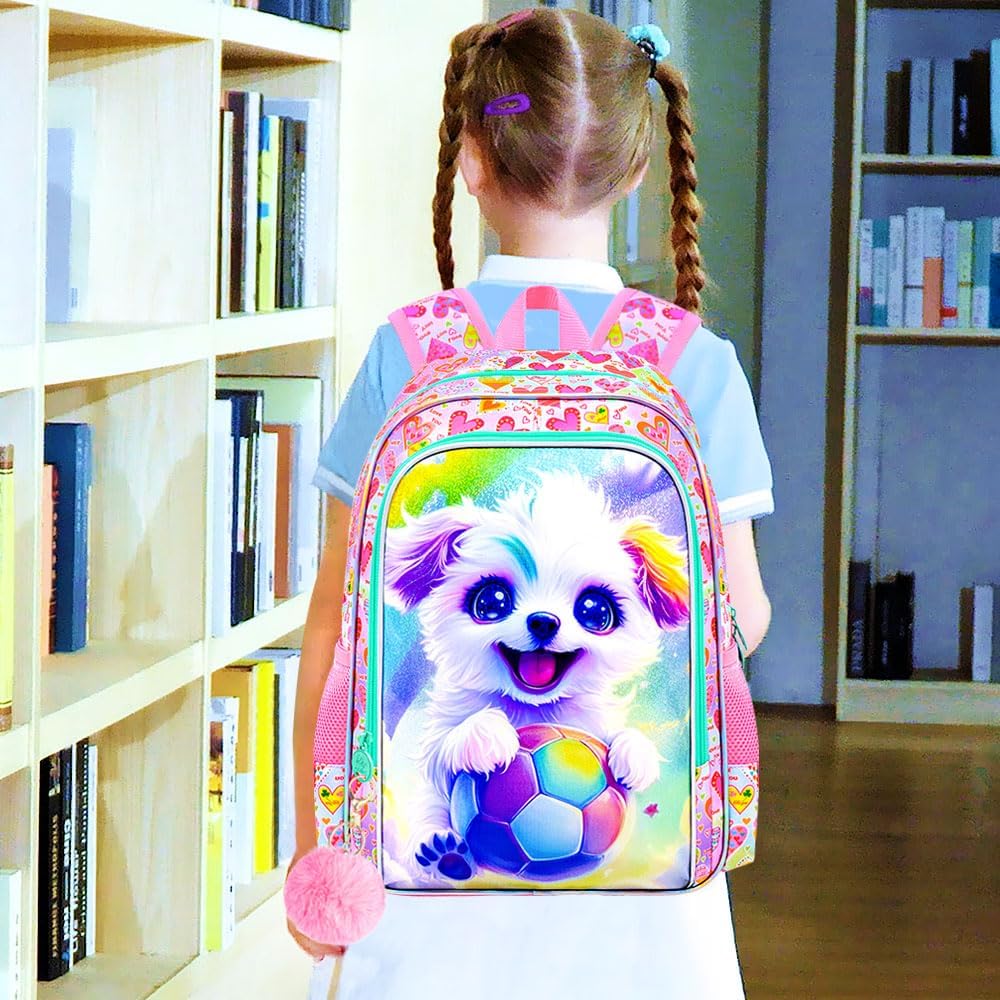 【Unique Design】This girls backpack is inspired by a cute dog playing colorful soccer, with an upgraded UV process. The colors are vivid and do not fade, encouraging children to enjoy the fun of sports.