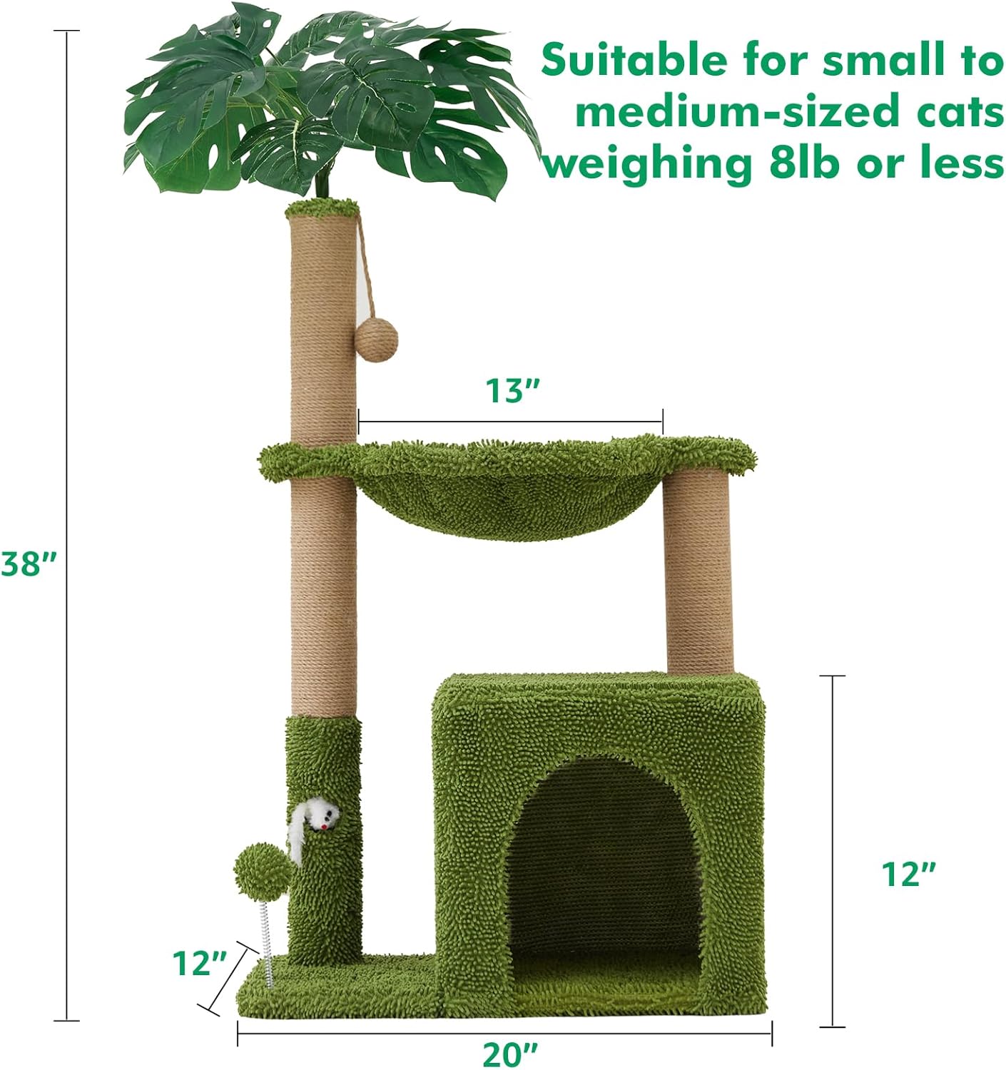 【Home Decoration with Green Plant Elements】The vivid green leaves and the color of the cat bed create an immersive jungle atmosphere that seamlessly blends with home decoration, while also stimulating the cat’s natural curiosity. It integrates functions such as sleeping, playing, lounging, frolicking, and scratching, taking into account both aesthetics and practicality. Bring nature indoors with our eco-chic cat tree.