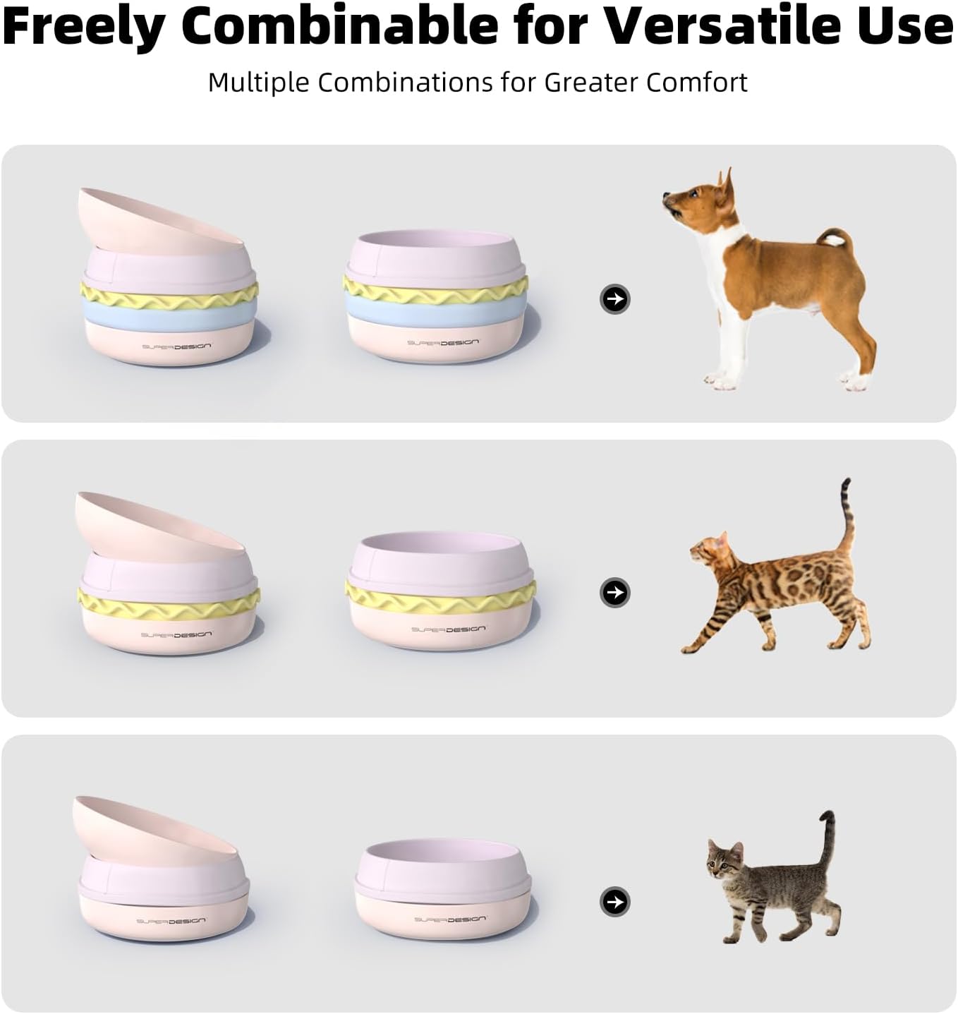 Adjustable Dog Dishes Height for Customized Comfort: The 5-piece design of pet bowls allows you to freely assemble the dog bowls small size dog to your desired height, catering to your dog’s unique needs. Whether you prefer a tilted angle for easier feeding or a different configuration, the modular setup offers endless flexibility.