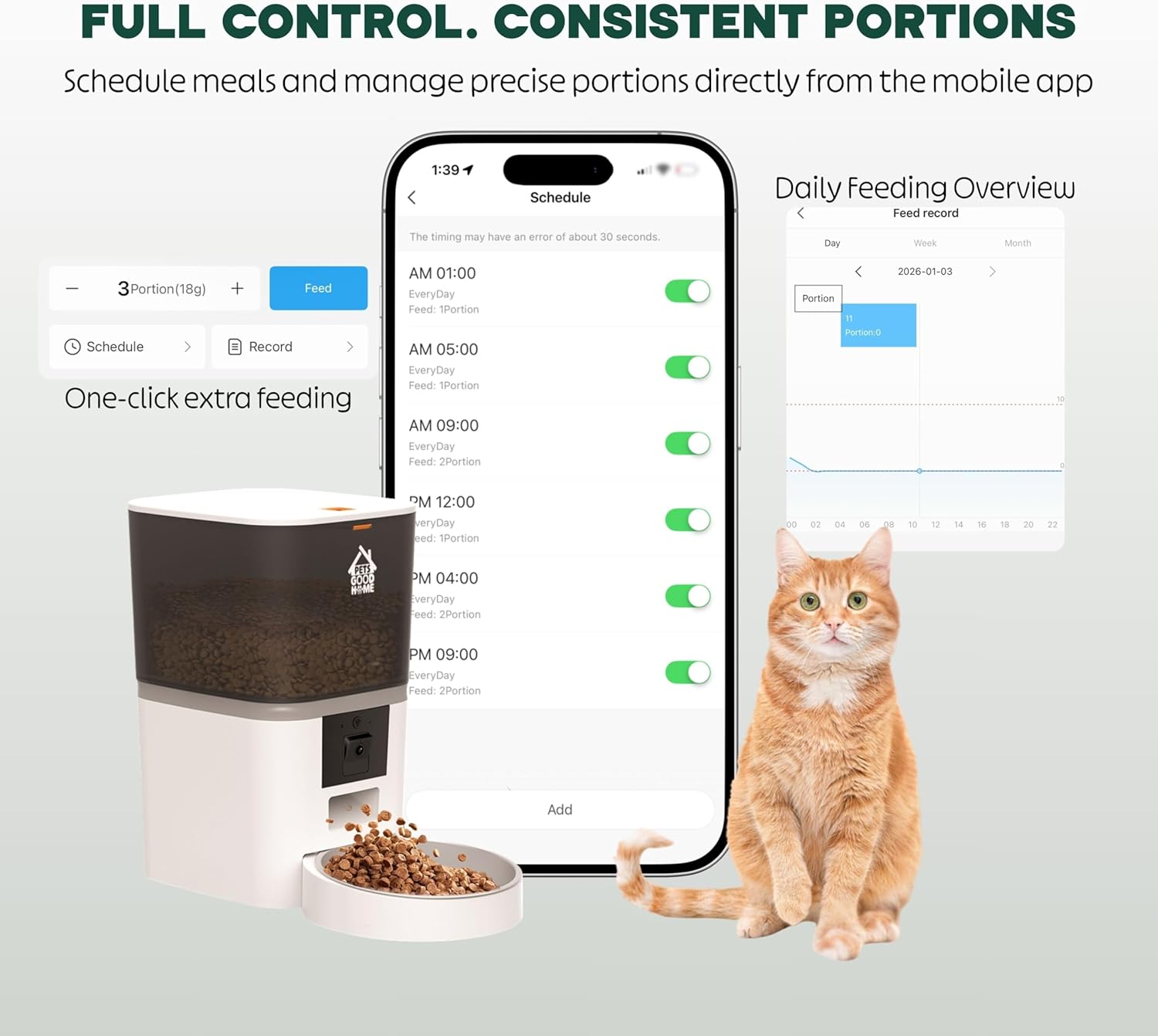 SMART APP CONTROL: Use the app on iOS and Android to set feeding times and customize portions with 10+ adjustable daily meals. Easily add or reduce portions to fit your pet’s routine, helping keep feeding balanced and consistent every day.