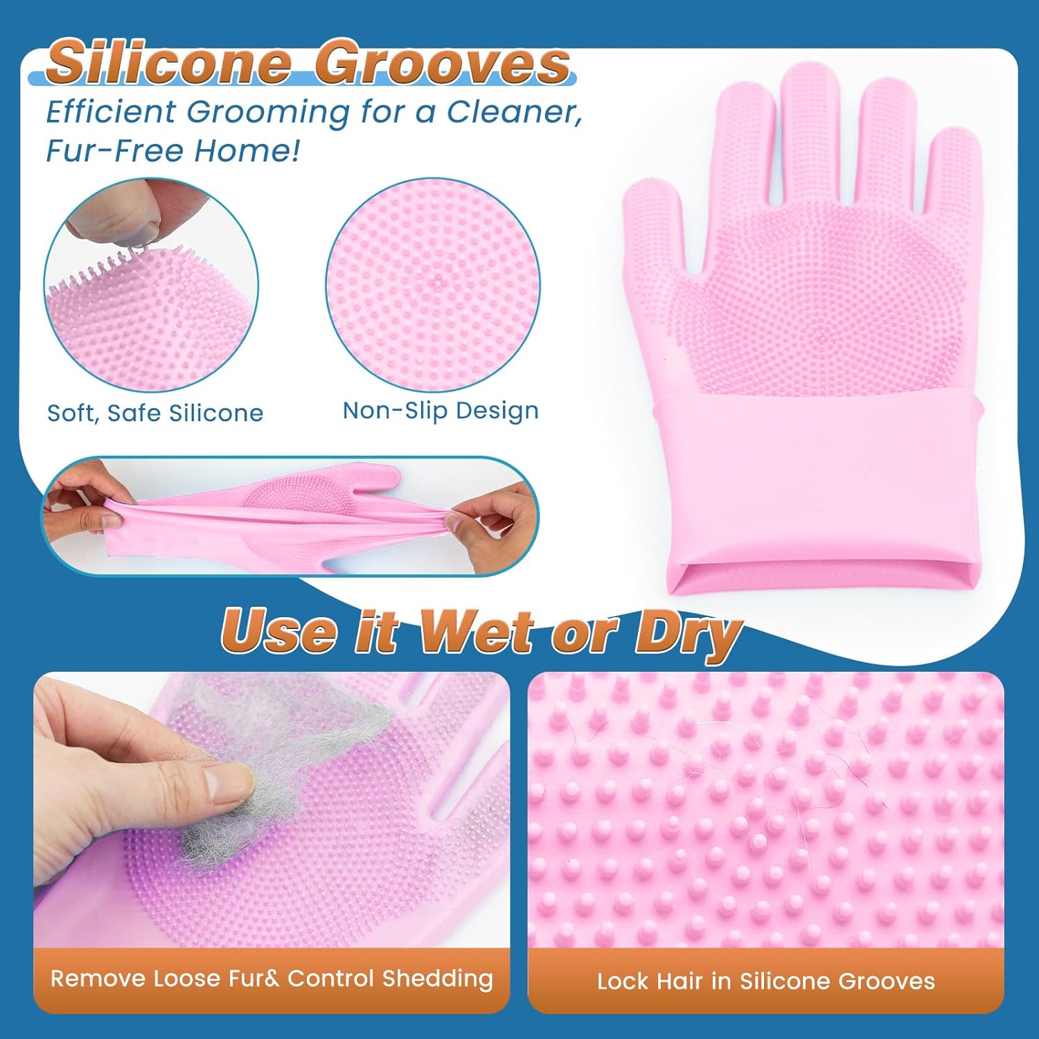 Made from thickened silicone material, the entire glove weighs 140 grams for lasting durability. A small amount of shampoo quickly creates a rich lather, while the glove’s surface features thousands of contact points to effectively remove shed hair and provide a gentle massage during bathing.