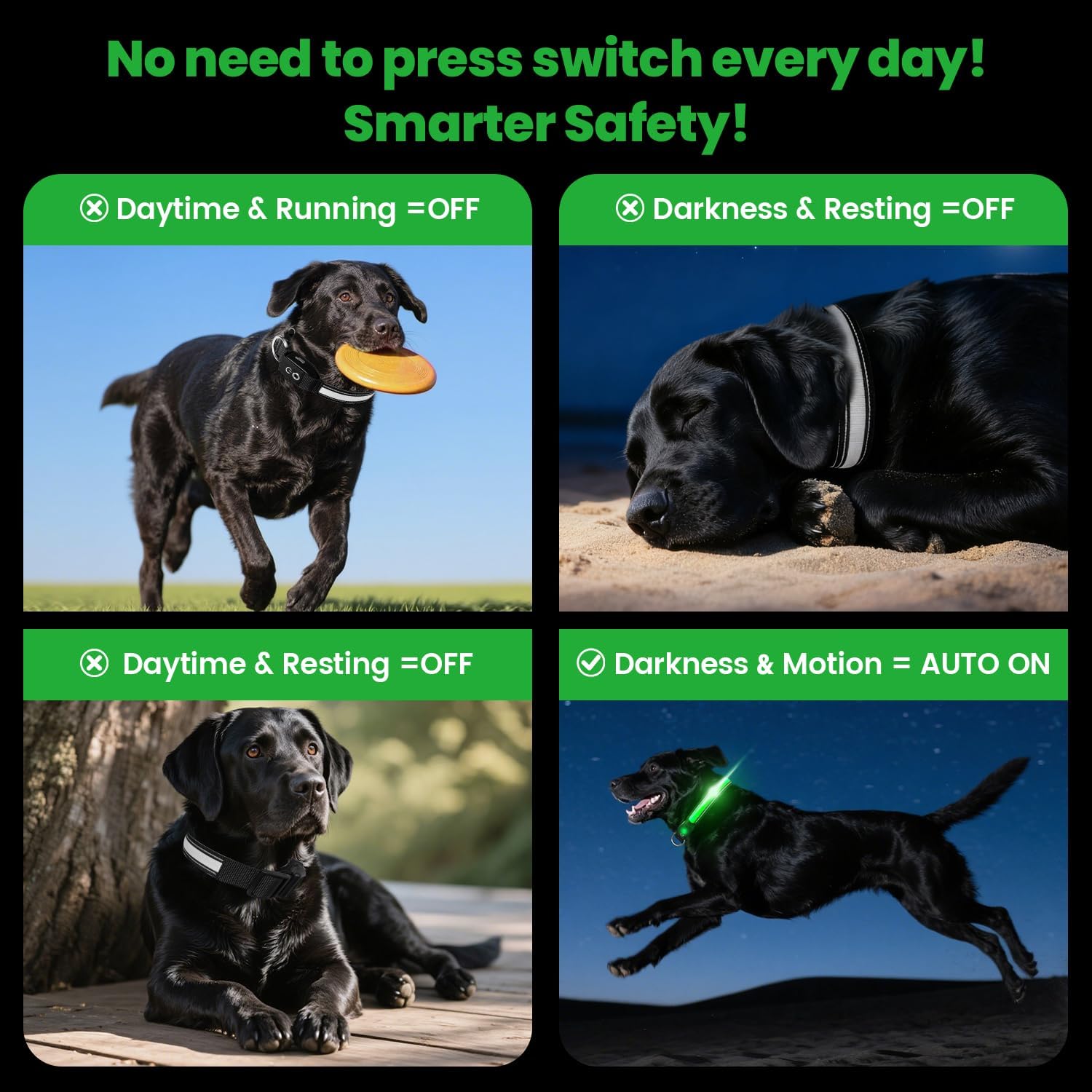 🤖 SMART AUTO-LIGHT TECHNOLOGY: Unlike ordinary dog collars, set ONCE and this dog light up collar activates automatically in darkness when motion is detected (evening walks/indoor play). No manual switch needed!