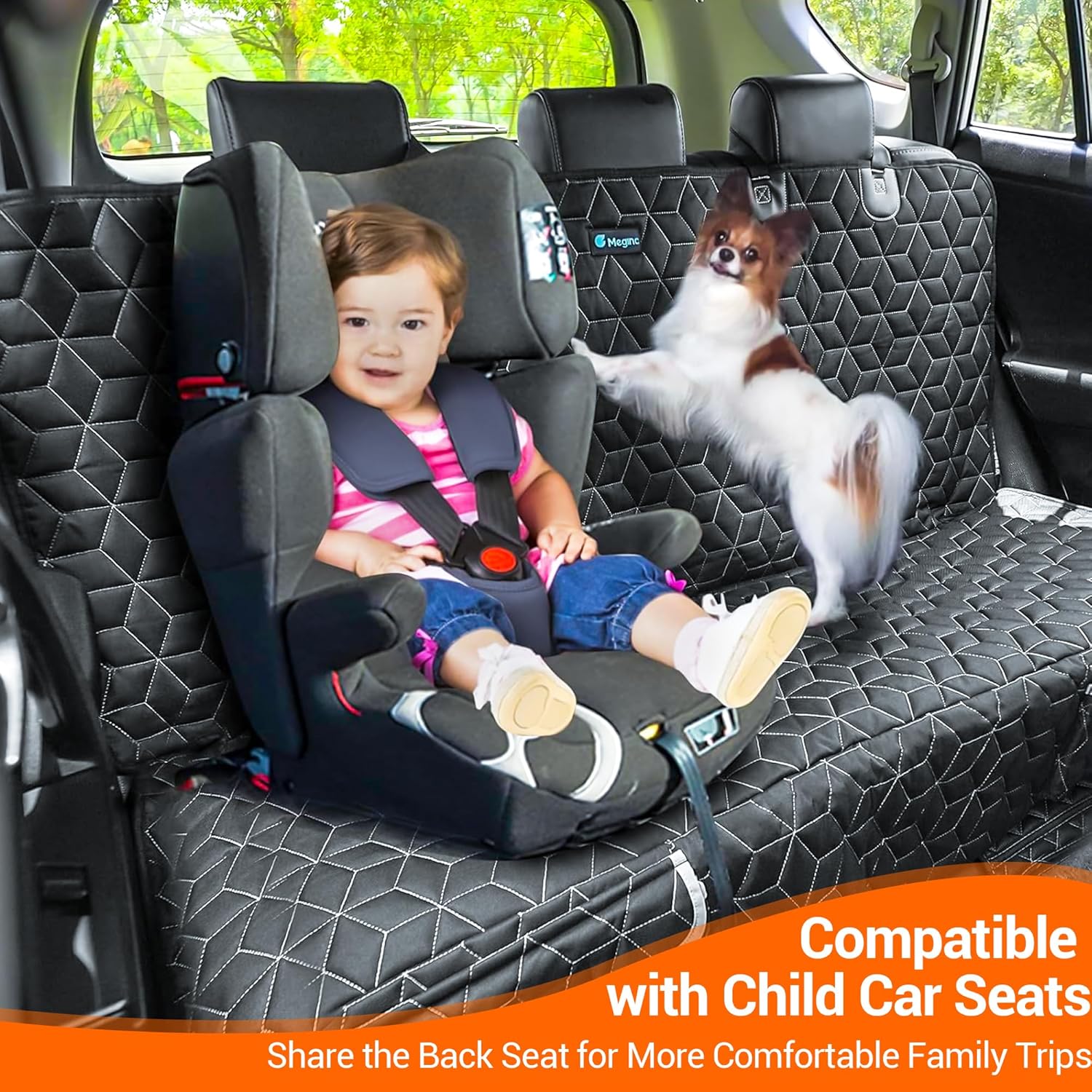Sturdy Material : HEAVYDUTY! HEAVYDUTY! HEAVYDUTY!Meginc dog seat cover for back seat is made of 600D Oxford cloth, 100g soft PP cotton, 210D polyester fabric, 100% waterproof TPU and PVC anti-slip mesh. A thick pet seat cover can mitigate the damage of your vehicle and protect carpet, upholstery from unpleasantries such as dog hair, urine, or vomit, moreover our protectors also providing a familiar, comfortable and safety space for your pets during the road travel.