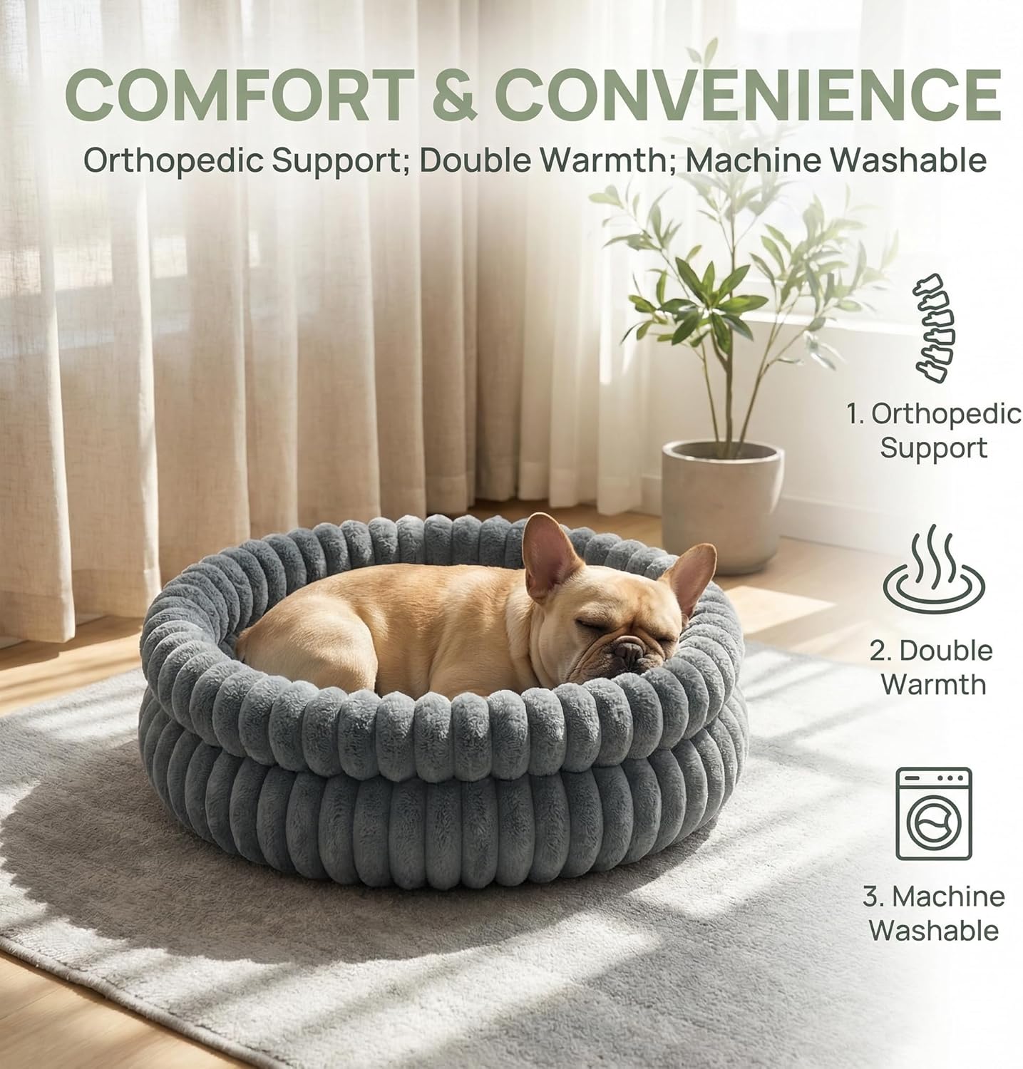 CALMING DESIGN: Ribbed fleece donut-shaped bed with raised edges provides a cozy, secure nest that helps reduce anxiety and promotes restful sleep for small dogs and cats