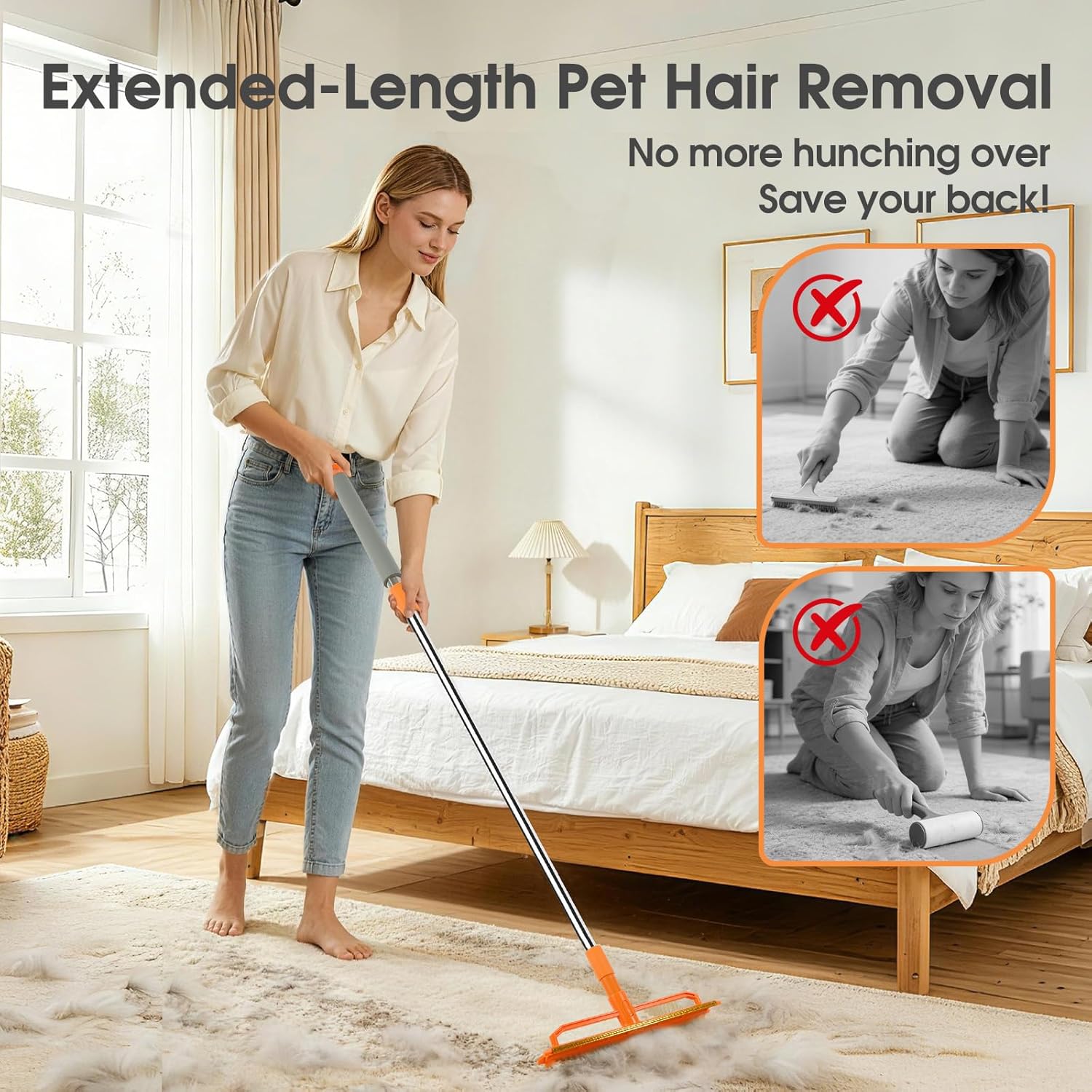 Adjustable Long Handle Pet Hair Removal Tool: This pet hair removal broom has an extended handle with 8 adjustable heights (29”-59”) to fit all users. It easily reaches high curtains, cabinets and hard-to-reach areas. The non-slip sponge handle ensures a comfortable grip, and the extra-long design lets you clean without bending or kneeling, relieving back and waist pressure.