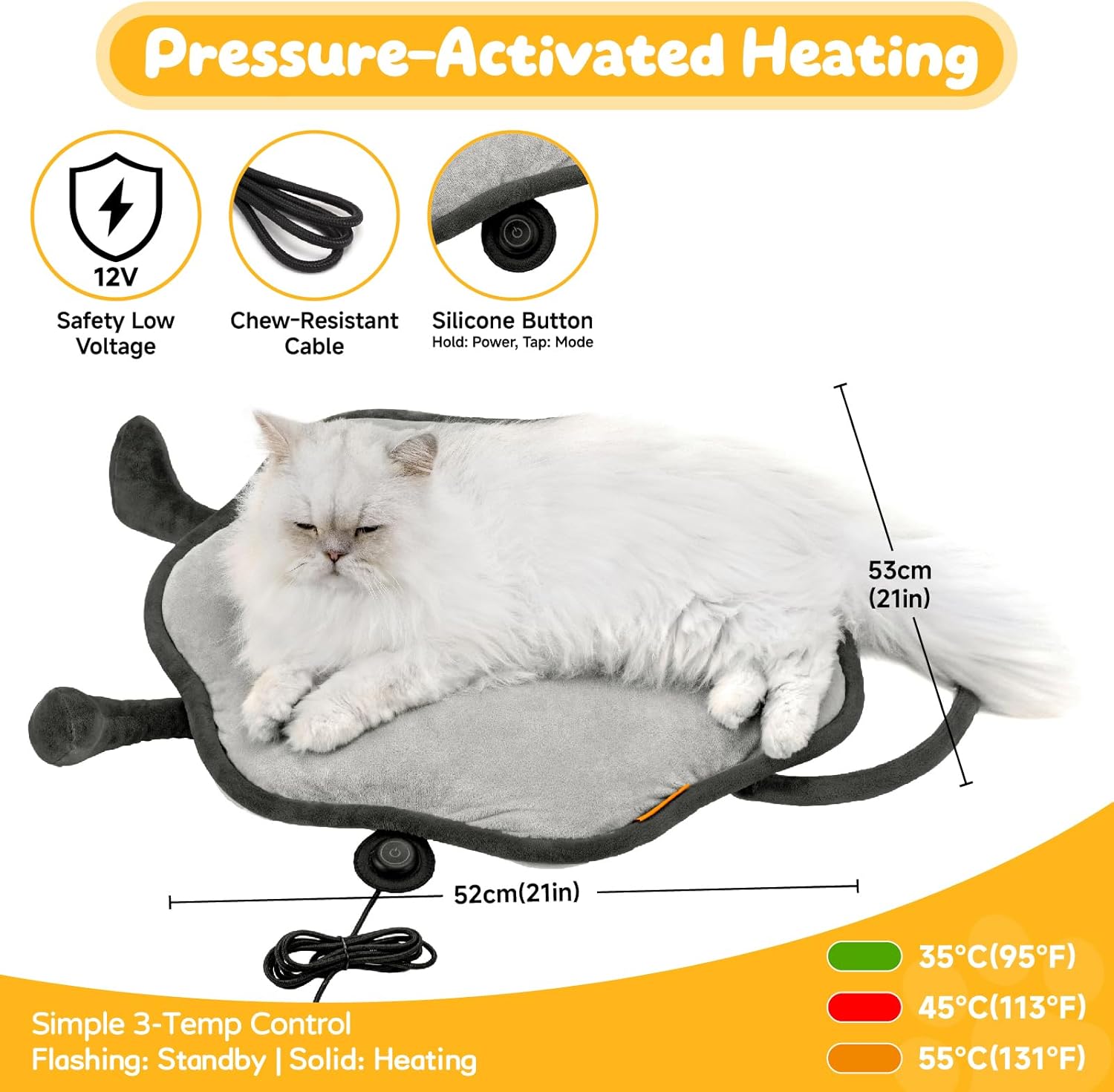 Pressure-Activated Heating: Automatically activates when your pet lies down. Flashing light indicates standby mode, while a steady light shows active heating. It uses a 12V low-voltage system with a nylon-braided, bite-resistant power cord to reduce risk of electrical incidents. Features simple 3-level temperature control: press and hold the silicone button for 2-3 seconds to turn on/off, and short press to cycle through settings. Green light: 35 C (low), red: 45 C (medium), orange: 55 C (high).