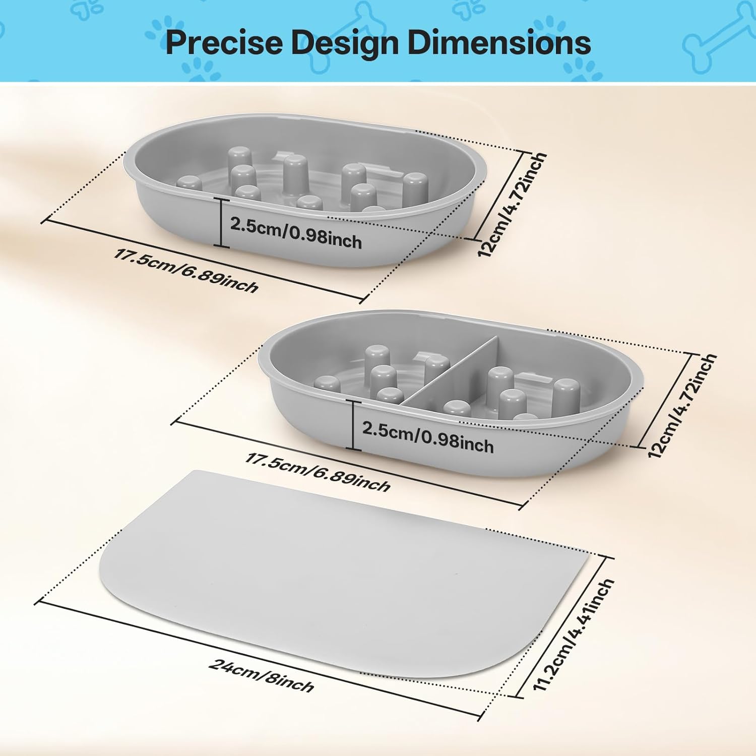 2 Slow Feeder Bowls: 1 Slow feed single bowl and 1 slow feeding split bowl, can hold 12 ounces food; Come with neoprene seal and non-slip base, which can lock in moisture, keep flies at bay help to keep food fresh, and prevent spills