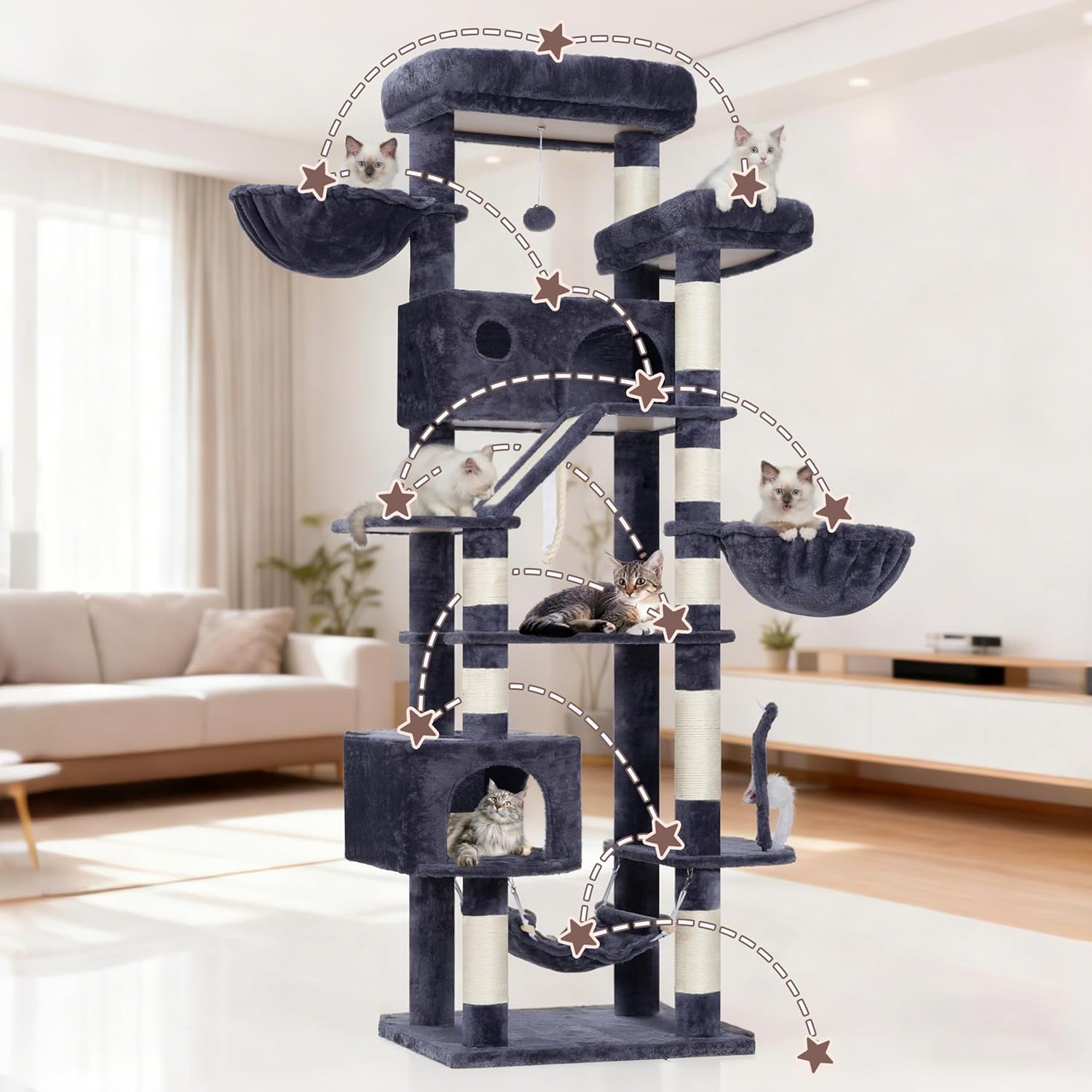 Versatile tall cat tree: This cat tree tower for indoor cats provides two platforms,tow cat houses,two deep cozy baskets, two palying spaces and one hanging hammock. So many features make it ideal for multi-cat households.