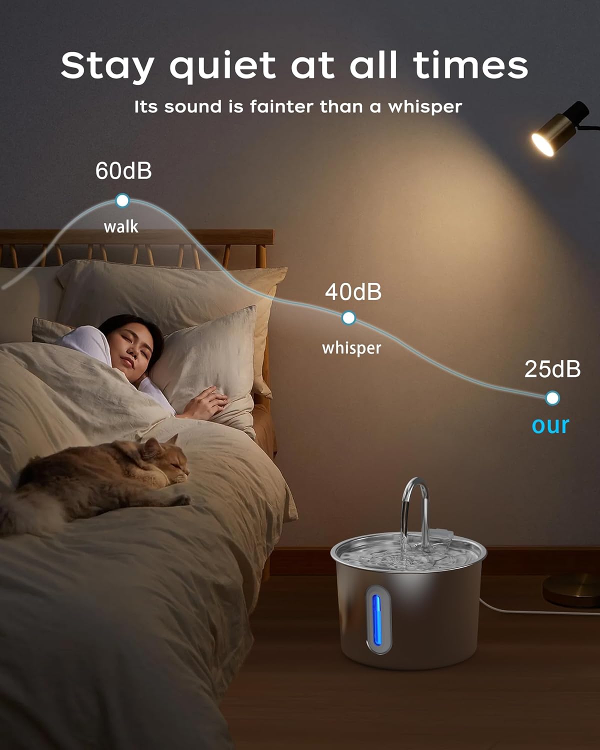 【304 Stainless Steel Quality】 This cat water fountain is crafted from high-quality 304 stainless steel,Free from BPA.It is more durable than plastic and easy to clean.Only the stainless steel components are dishwasher safe.