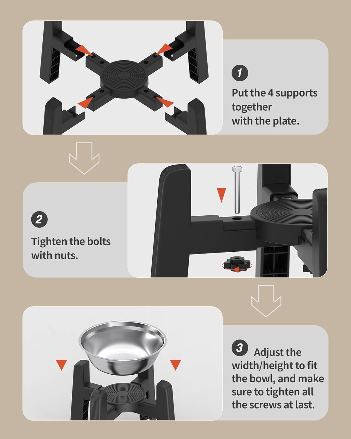 [Easy Assemble and Use] You could assemble and adjust this CZPET raised bowl only by hand! Once you get the pet bowl stand, you just need to tighted the screws by hand. Then you will finish the assembly within 5 minutes. If you want to adjust it to fit different bowls, all you have to do is just loosen the screws by hand and then adjust freely.