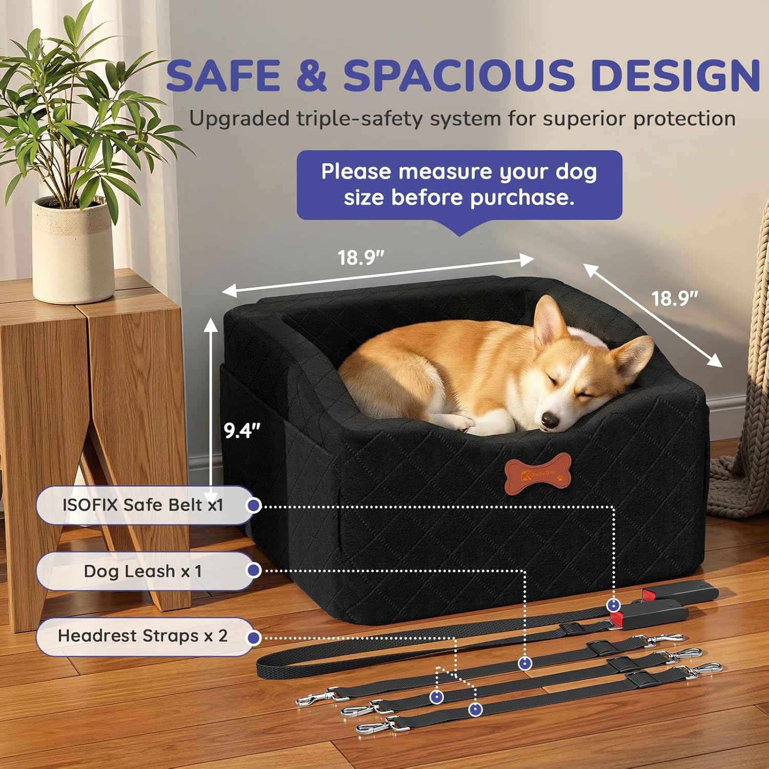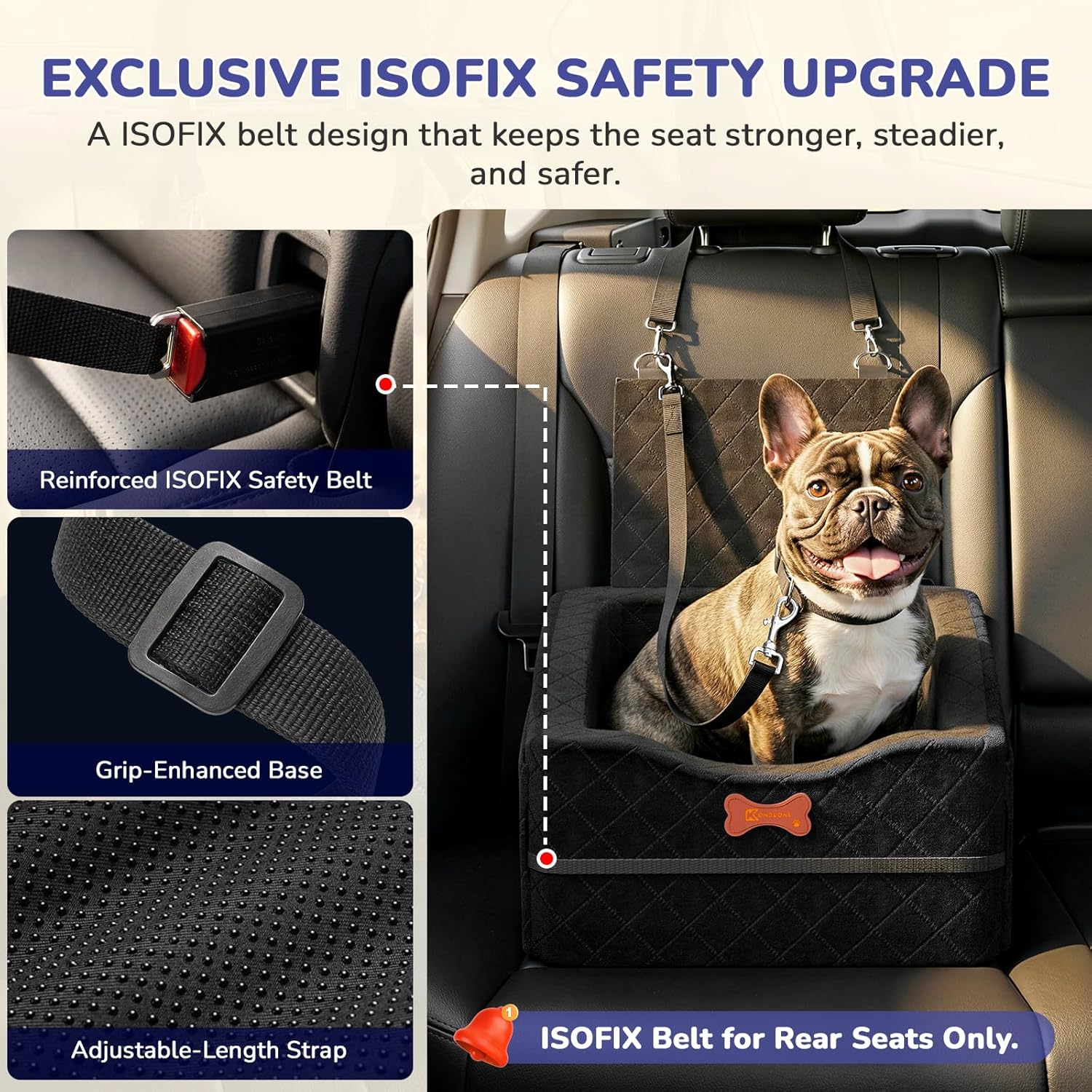 UPGRADED STABILITY & COMFORT: This dog car seats for small dogs is equipped with an ISOFIX belt, 2 headrest straps, and a dedicated dog safety leash to provide triple fixation for enhanced stability. The anti-slip base effectively prevents the seat from shifting, offering multiple layers of protection for your pet during travel. The raised bone-shaped side design boosts the sense of security while maintaining riding comfort, ensuring a safer and more comfortable journey for your furry companion.
