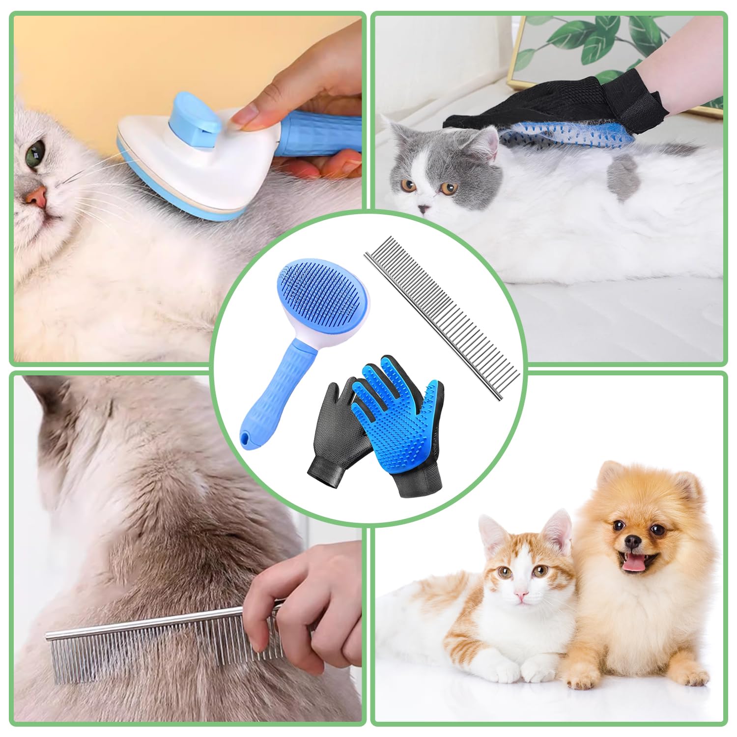 【Perfect Grooming KIT】1 pcs Dogs & Cats Brush,1 pair Dogs & Cats Grooming Glove,1 pcs Dogs & Cats Metal Comb The grooming kit can be used short, medium and long, thick, thin and curly haired pets,let your pet’s coat soft and shiny