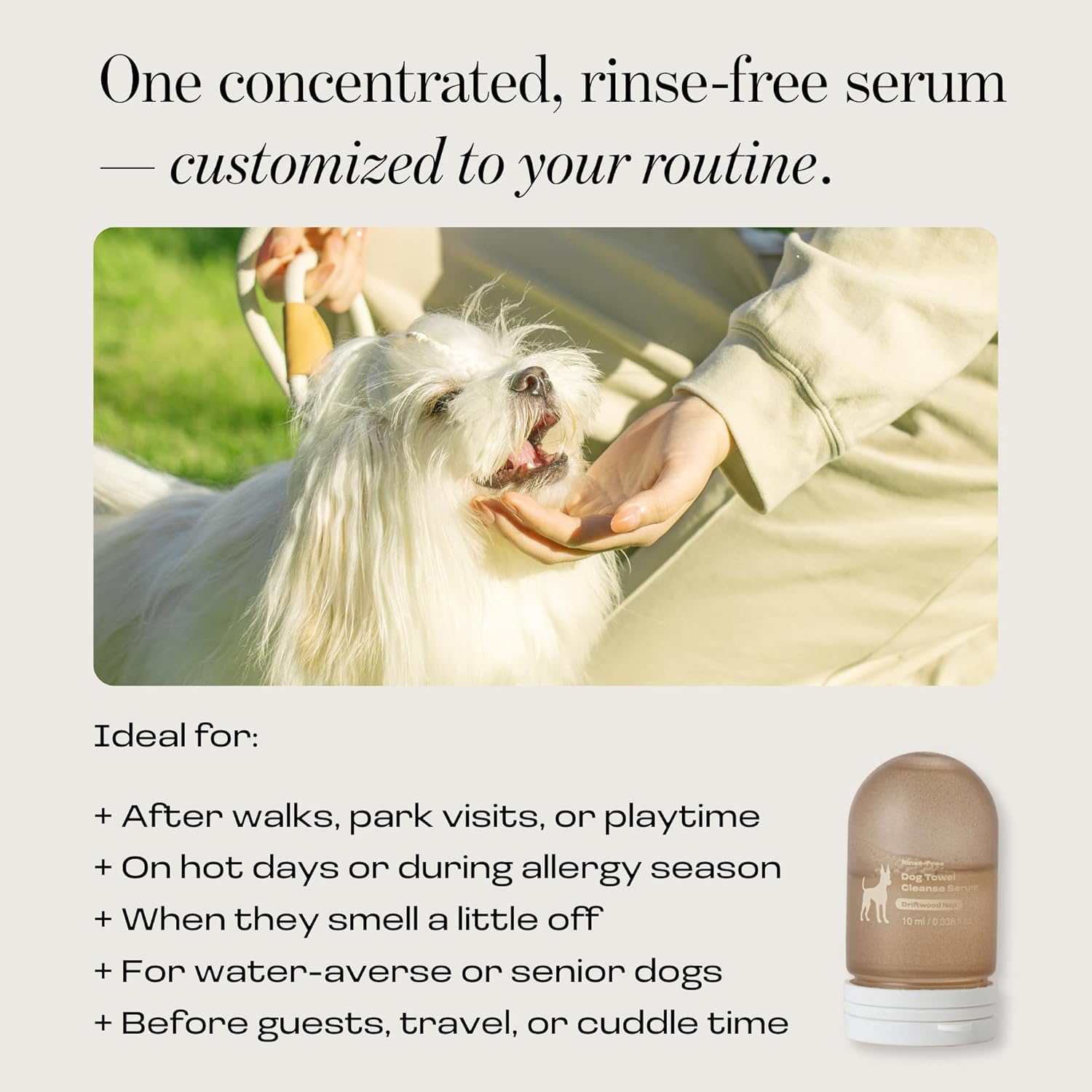 Quick, Low-Stress Towel Cleanse Ritual: Perfect for in-between baths, rainy days, muddy paws, post-walk cleanups, long-hair breeds, grooming-shy dogs, and senior dogs. This no-rinse towel-cleanse method helps reduce bath stress, leaving the coat soft, refreshed, and deodorized in minutes. No tub. No water. No mess.