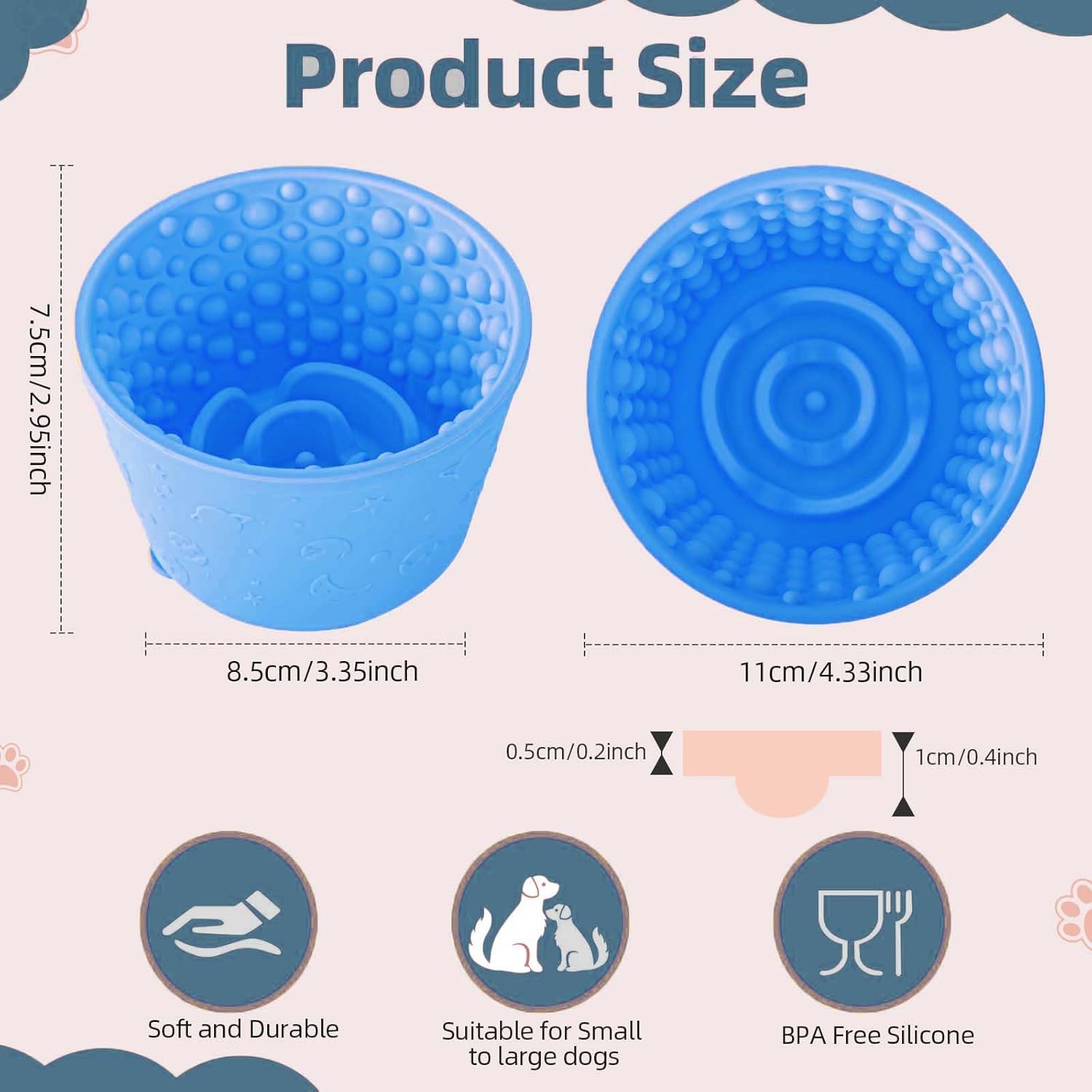 Versatile Design: We combine the functions with the slow feeder and the treat licking distractor. You can freeze soft foods like peanut butter or coconut oil spread on the inside of the bowl to extend the licking interaction