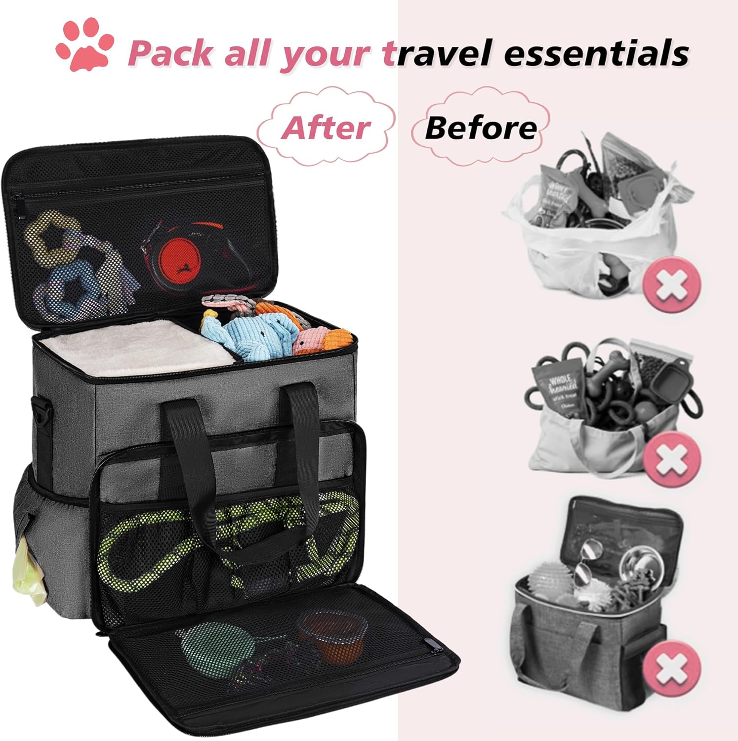 Dog Travel Bag, Large Pet Travel Set with Multi-Function Pockets, 2 Food Storage Containers, 2 Collapsible Bowls, 1 Feeding Mat for Pet Supplies, Road Trip Essentials, Weekend Camping (Black)