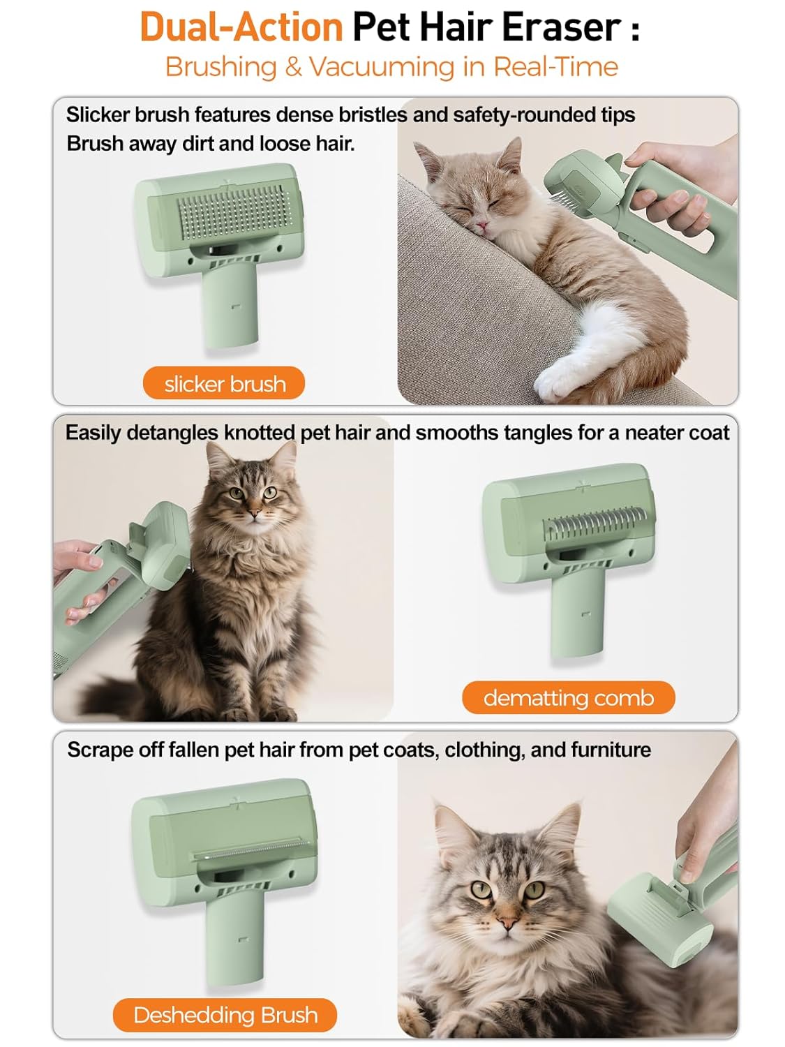 【More Than a Pet Grooming,It’s a Mini Vacuum】More than just cat or dog deshedding tool – switch to the long suction nozzle and easily transform it into a cordless portable mini vacuum. Daily Cleaning: Efficiently manage pet hair and food debris.Car Cleaning: The wireless design adapts to tight car spaces, cleaning pet hair and snack residue in seat crevices.Multi-scene Home Use: Clean dust and debris from tight spaces like windows, sofas, under beds, and home appliances.