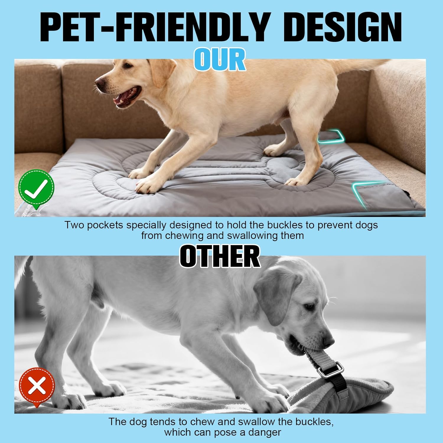 Comfortable & Pet-friendly: The comfortable and soft texture provides your dog with a rest experience similar to that at home. It is made of breathable materials that do not cause overheating, and can be used throughout the year. It is made of pet-friendly fabric, and on the two corners of the grey side, there are two pockets specially designed to hold the buckles, to prevent dogs from chewing and swallowing them.