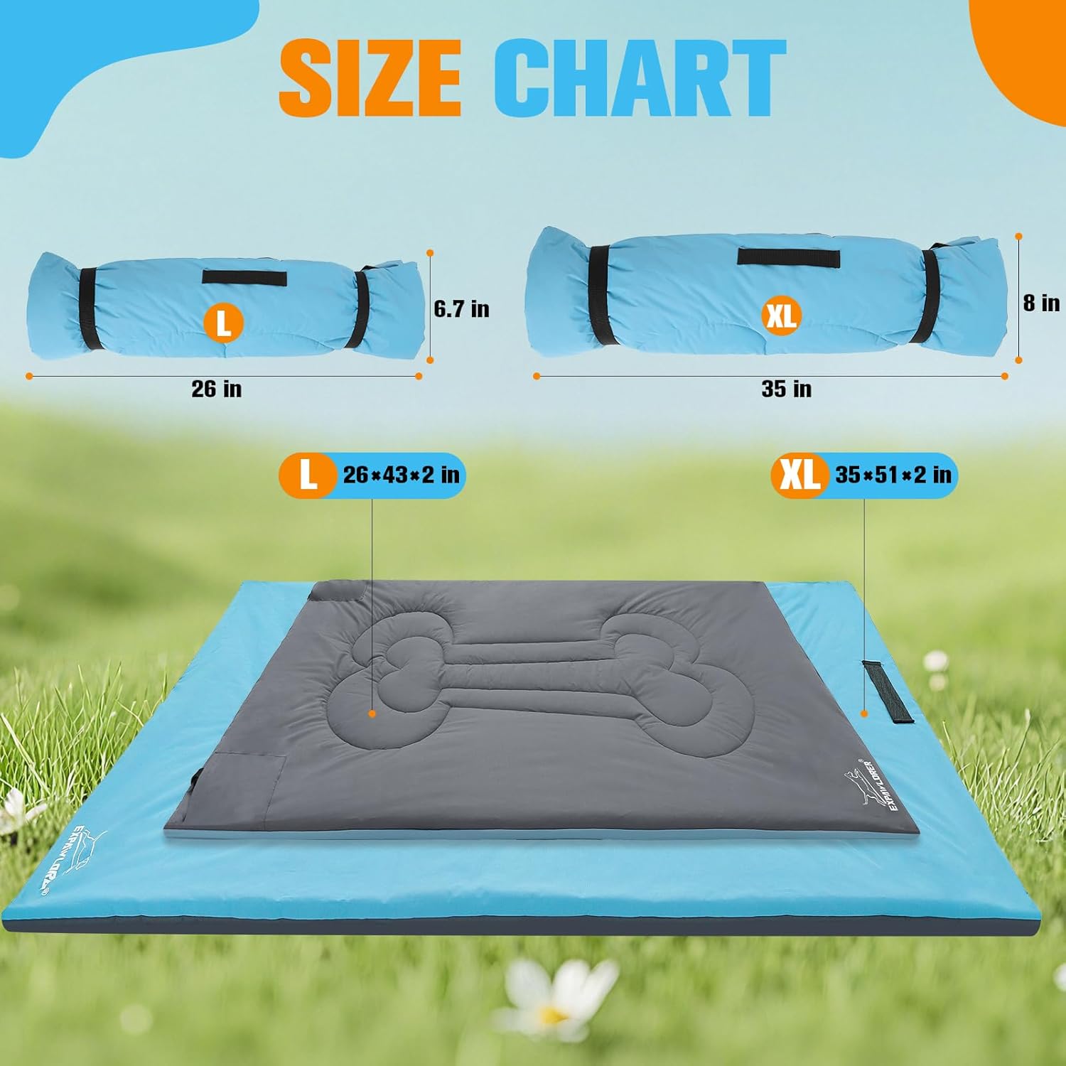 Outdoor Travel Dog Bed: Size L: 26×43×2 in, Size XL: 35×51×2 in. Suitable for most pets. It features a simple and solid color design. One side of it is grey and the other side is blue. After receiving it, please first shake and tap it to ensure it is fluffy. If you have any questions, just reach out and we will help to solve any problems.
