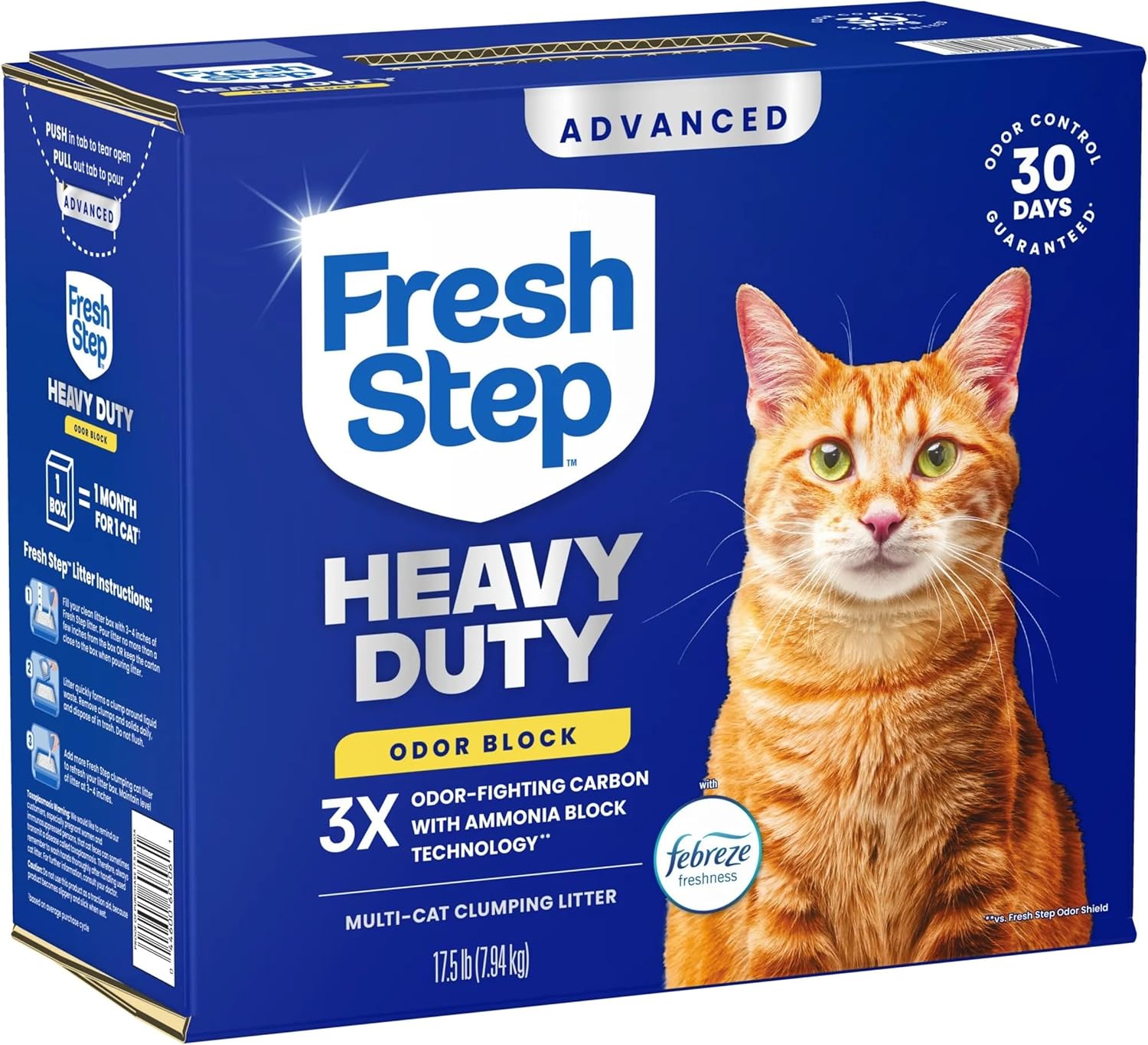 CLUMPING LITTER: One 17.5-lb. box of Fresh Step Advanced Heavy Duty Clumping Litter With Febreze Freshness, featuring 3X odor-eliminating carbon (1) for Fresh Step’s longest odor-fighting formula (3)