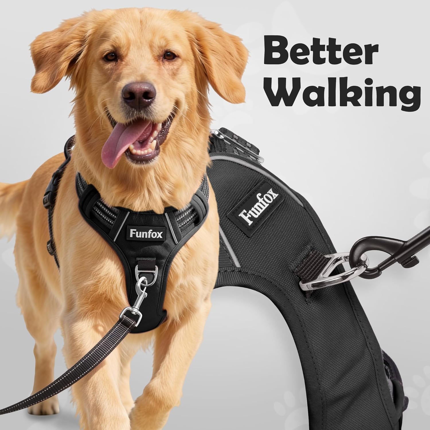 No Pull Dog Harness Size for Small Medium Large Breed Text reads 'FUNFOX No Pull Dog Harness' and 'Easy walk, happy dog.' Repeated marketing image showing Golden Retriever with harness from multiple angles.Text reads 'FUNFOX No Pull Dog Harness' and 'Easy walk, happy dog.' Repeated marketing image showing Golden Retriever with harness from multiple angles.