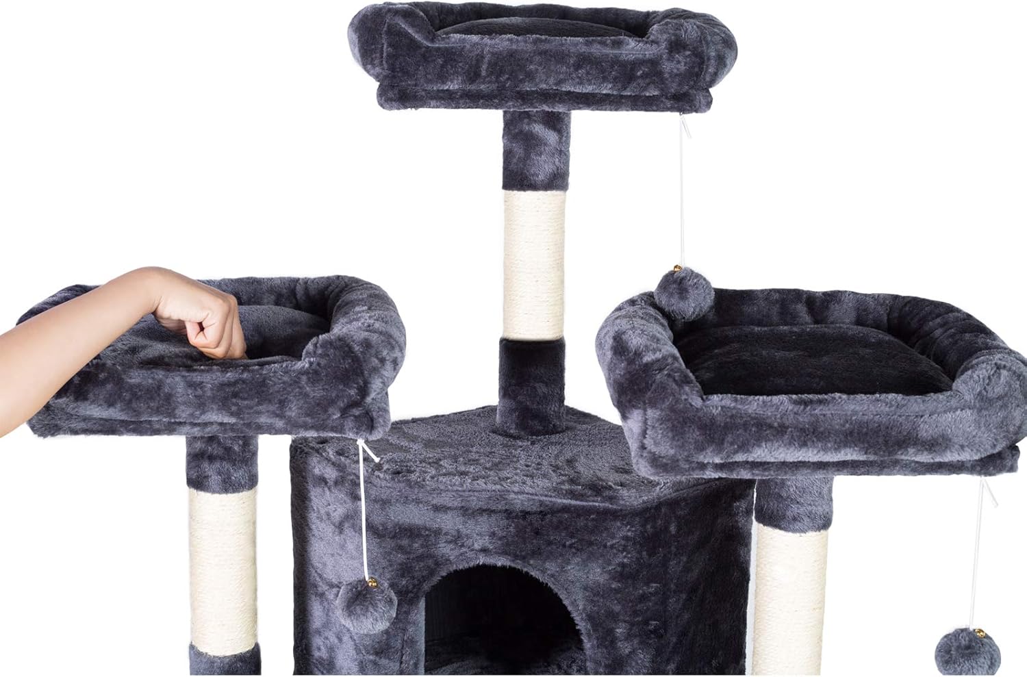 COMFY HOME FOR ENTERTAINING: 3 roomy condos offer luxurious napping experience; 3 plush perches with raised edge allow more safety for cats to enjoy the feeling of the top of the world while resting; 3 interactive jingly balls to play with, several layers layout for climbing up and down, sisal-covered slope adds so much more fun for playtime.