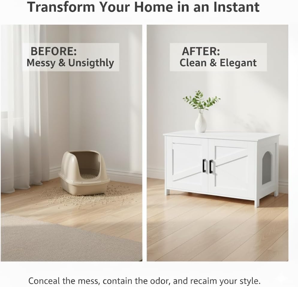 Fits Most OF Litter Boxes: Sized 31.5” L x 19.7” W x 19.7” H, The cat furniture is big enough for most of litter box and avoid litter scattering