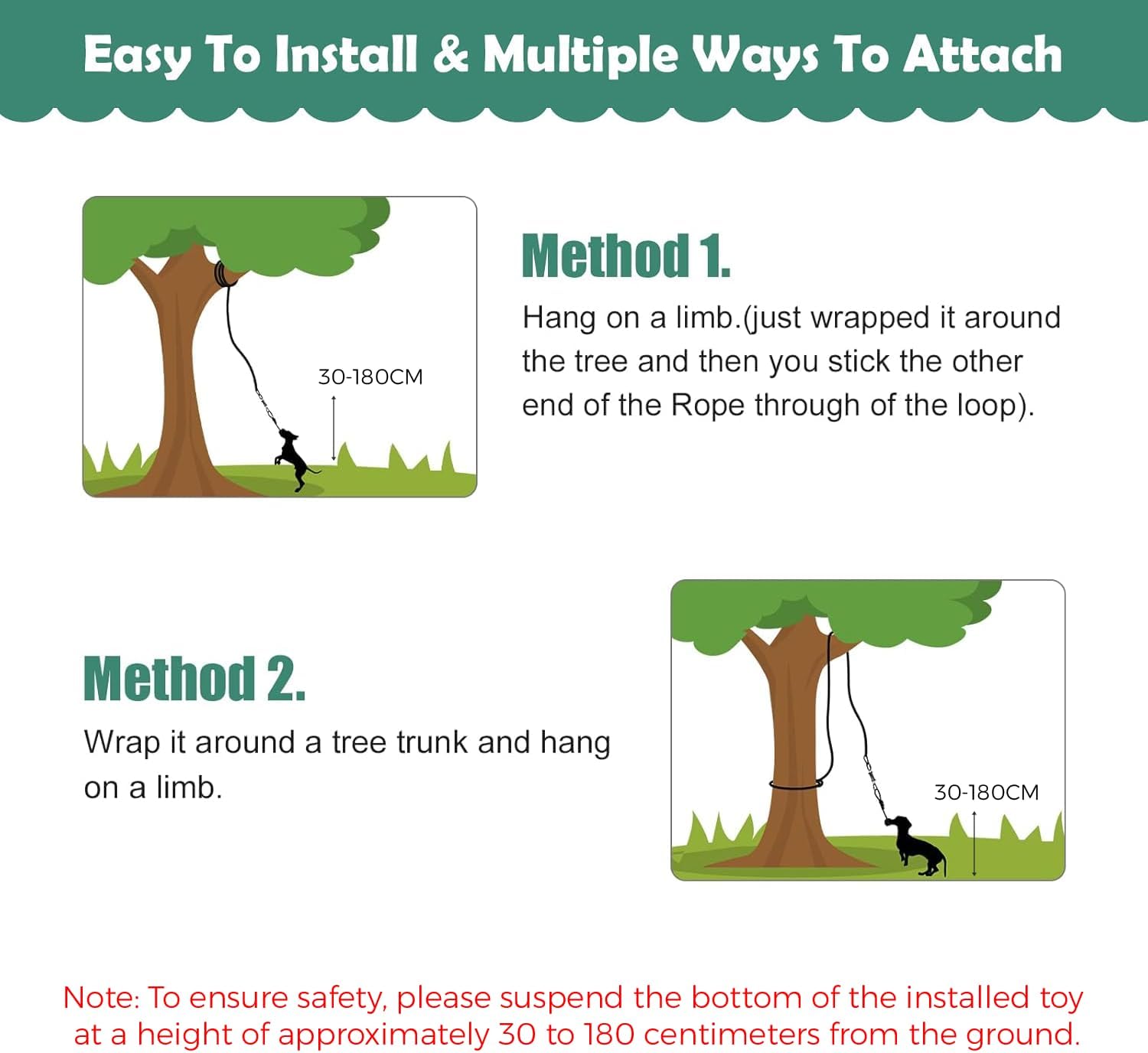 🎄【Easy to Hang and Adjustable】This 16-foot long dog rope toy is suitable for large dogs. You can throw the elastic rope over a sturdy branch, tie it, and then pull. Of course, you can also hang this toy on a branch, beam, terrace, or other objects with a certain height support. You can adjust the height of this dog rope toy to make this interactive spring pole toy more challenging for your beloved dog.