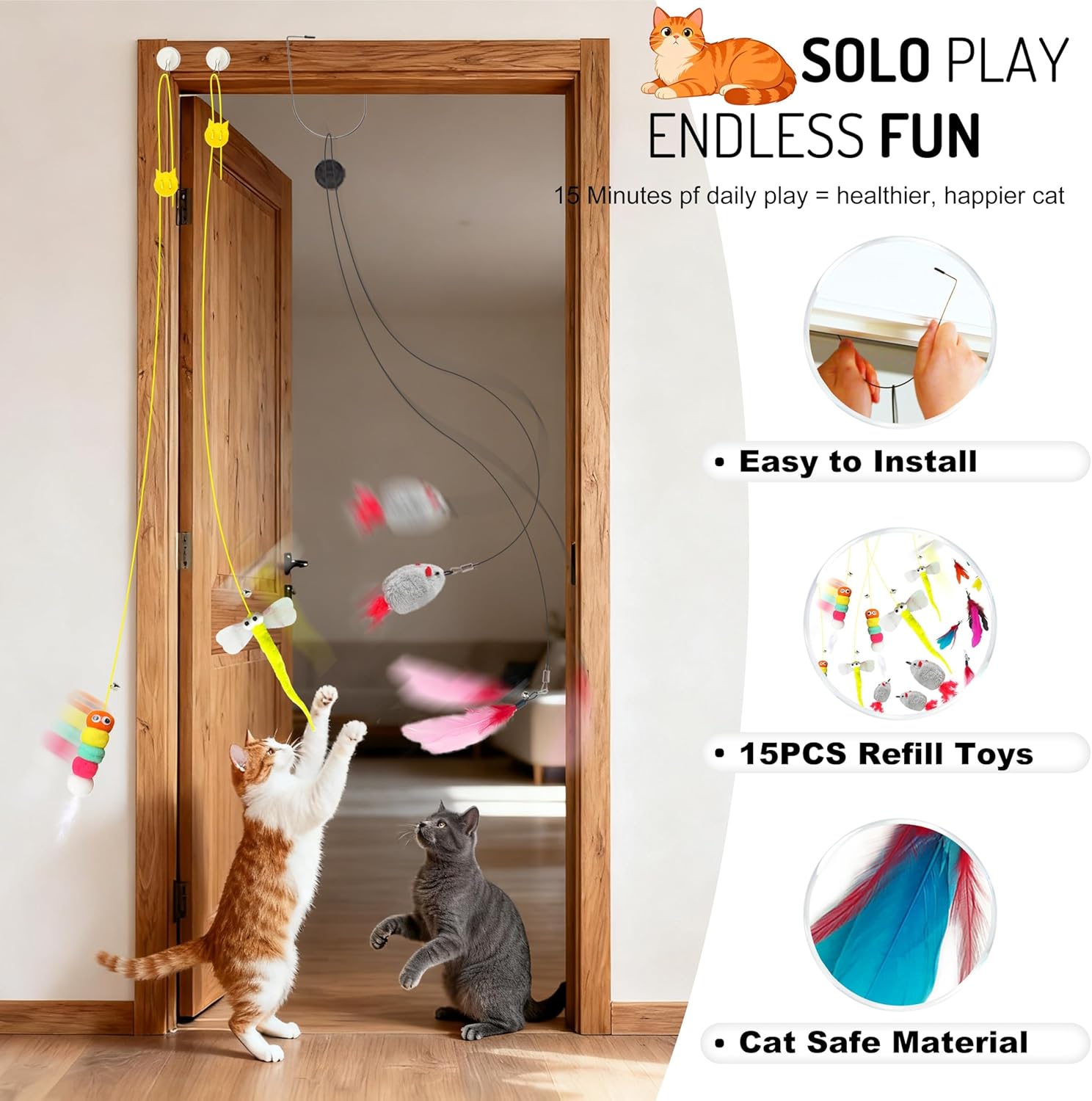 3 No-Battery Chirping Mice & 6 Feather Refills: The door toy includes 6 feather attachments and 3 chirping mice that emit a realistic bird-like sound with movement. This battery-free feature effectively triggers your cat’s hunting instinct for prolonged, self-play.