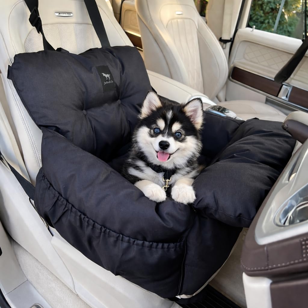 JACKO & CO Premium Dog Car Seat – Safe & Cozy Travel Bed and Carrier for Small Dogs, Puppies, Pets up to 25 lbs, Clip-On Leash & Storage Pockets, Water-Resistant, Machine Washable (Black, Small)