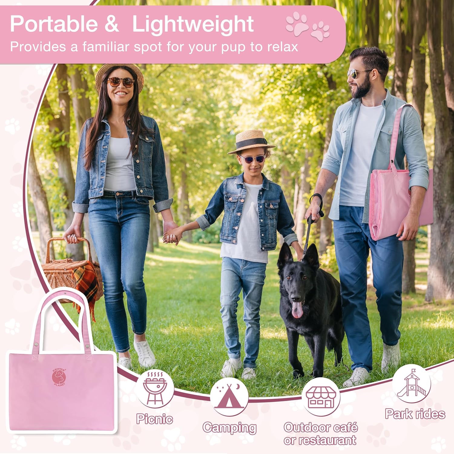 Kritter Planet Waterproof Foldable Dog Bed Pad for Camping & Travel, Portable Roll-Up Dog Bed Car Seat Pet Cushion Mat with Handles for Small & Medium Dogs, Indoor & Outdoor Use, Pink