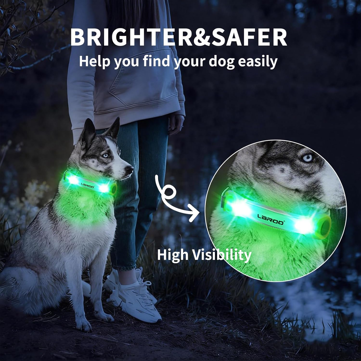 LaRoo Dog Collar Light Dog Lights for Night Walking, Universal LED Safety Lights for Leash Harness for Nighttime Running, Pet Night Outdoor Safety with Nylon Stickers (Green)