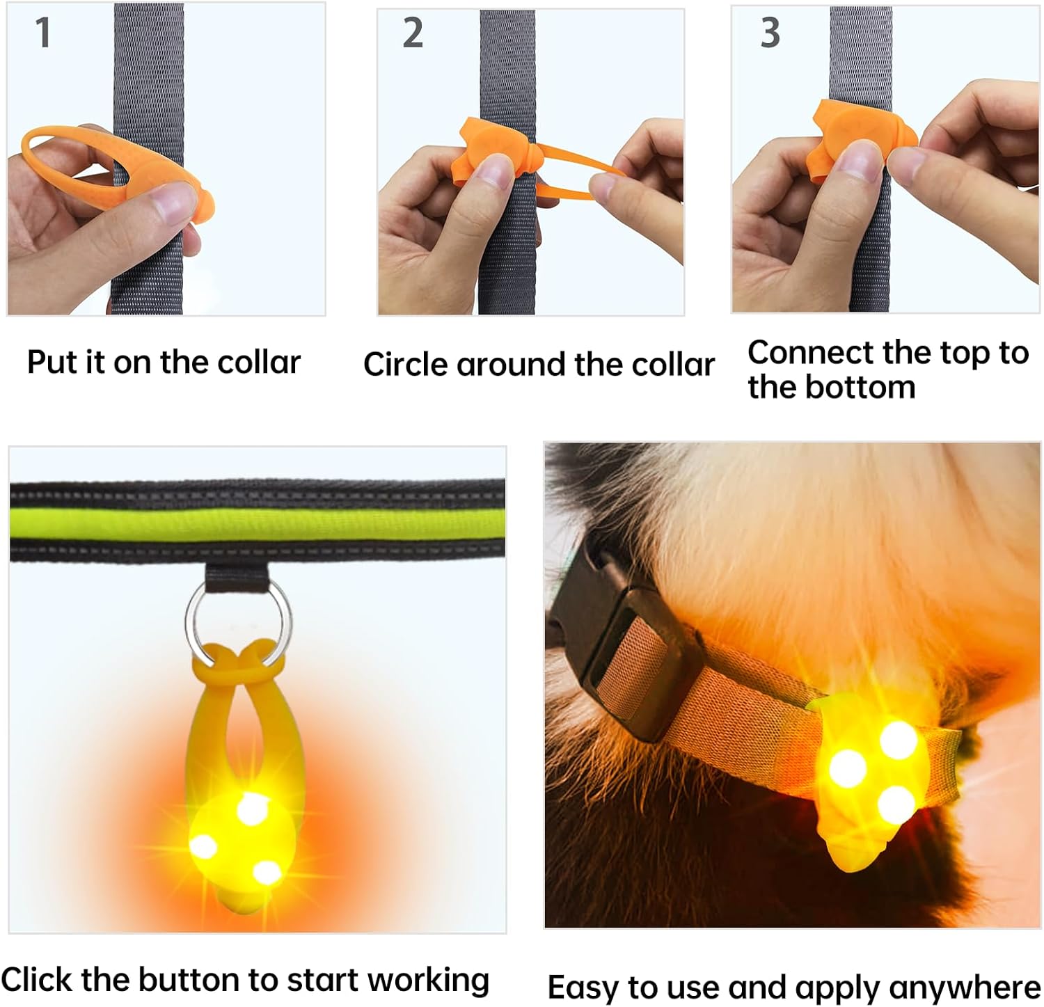 Food-grade silicone material ,lightweight and water resistant attach to light makes for a perfect, which feel more comfortable when touch skin ,all-weather dog collar charm or dog collar light for when your pup is playing out in the dark.