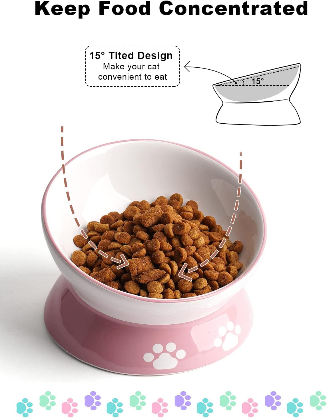 🧸 Tilt Angle Design: 5 inches in width, the tilted cat food bowl keeps food piled or falls to the center, it helps keep the food from being pushed off the bowl, easy for your cat to eat. Perfect for flat face cats.