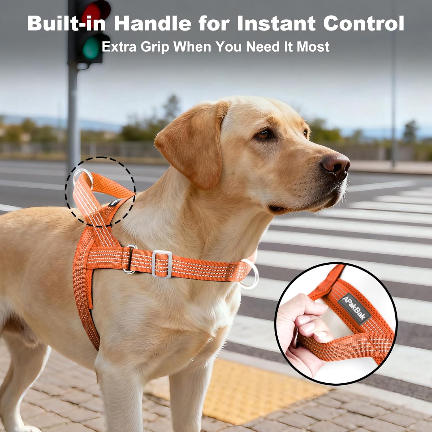 Built-in Handle for Close Control. A sturdy handle on the back provides instant control when crossing streets, training, or hiking on uneven ground. Combined with quick-fit buckles, it makes walking your dog simpler and safer