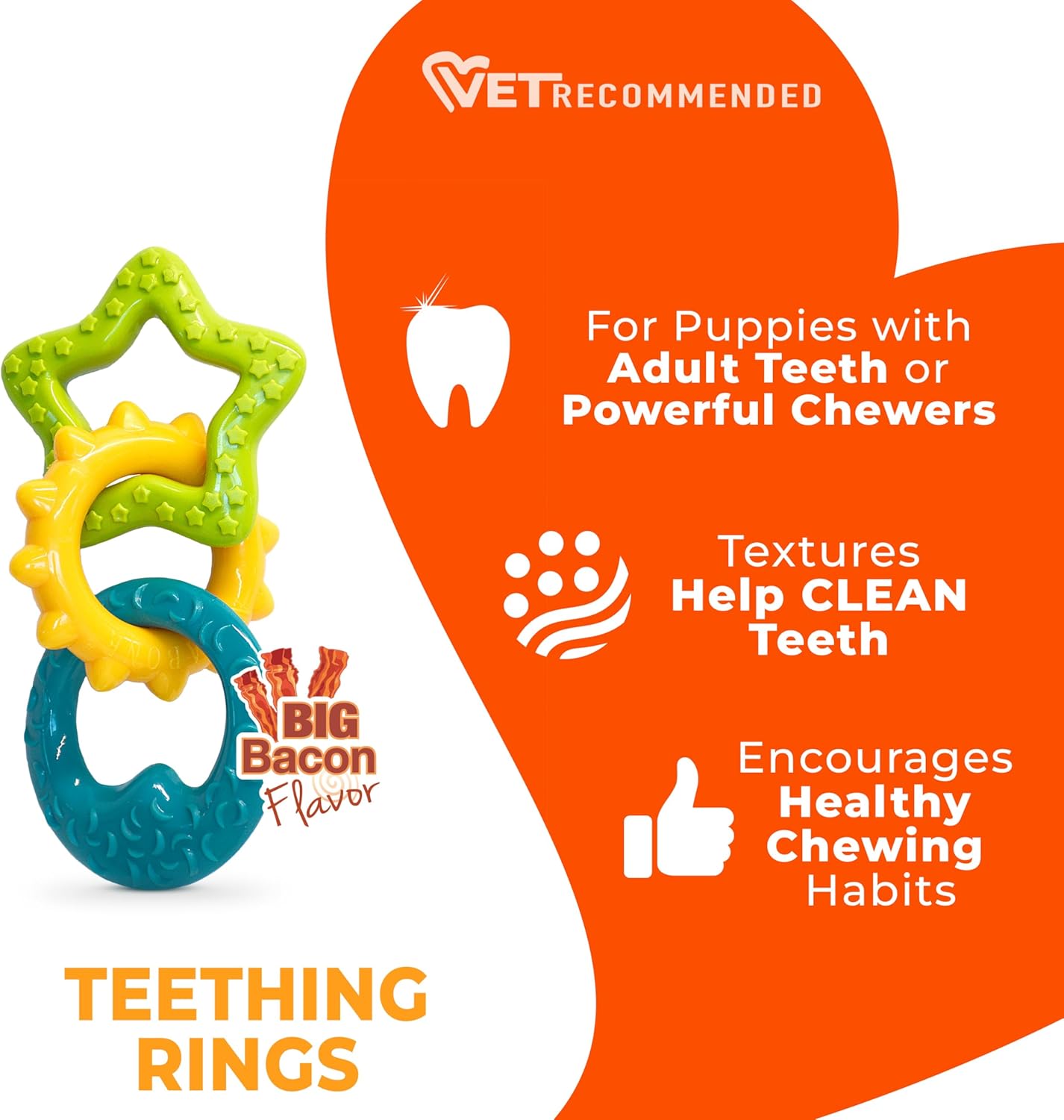 Satisfy your powerful-chewing pup’s natural chewing instinct with these durable teething rings for puppies! Featuring 3 fun textured shapes with enticing flavor throughout, this puppy chew toy keeps dogs engaged while helping clean teeth as they chew. Made with heart and purpose, this veterinarian-recommended dog toy for puppies will start your pup off on the right paw!