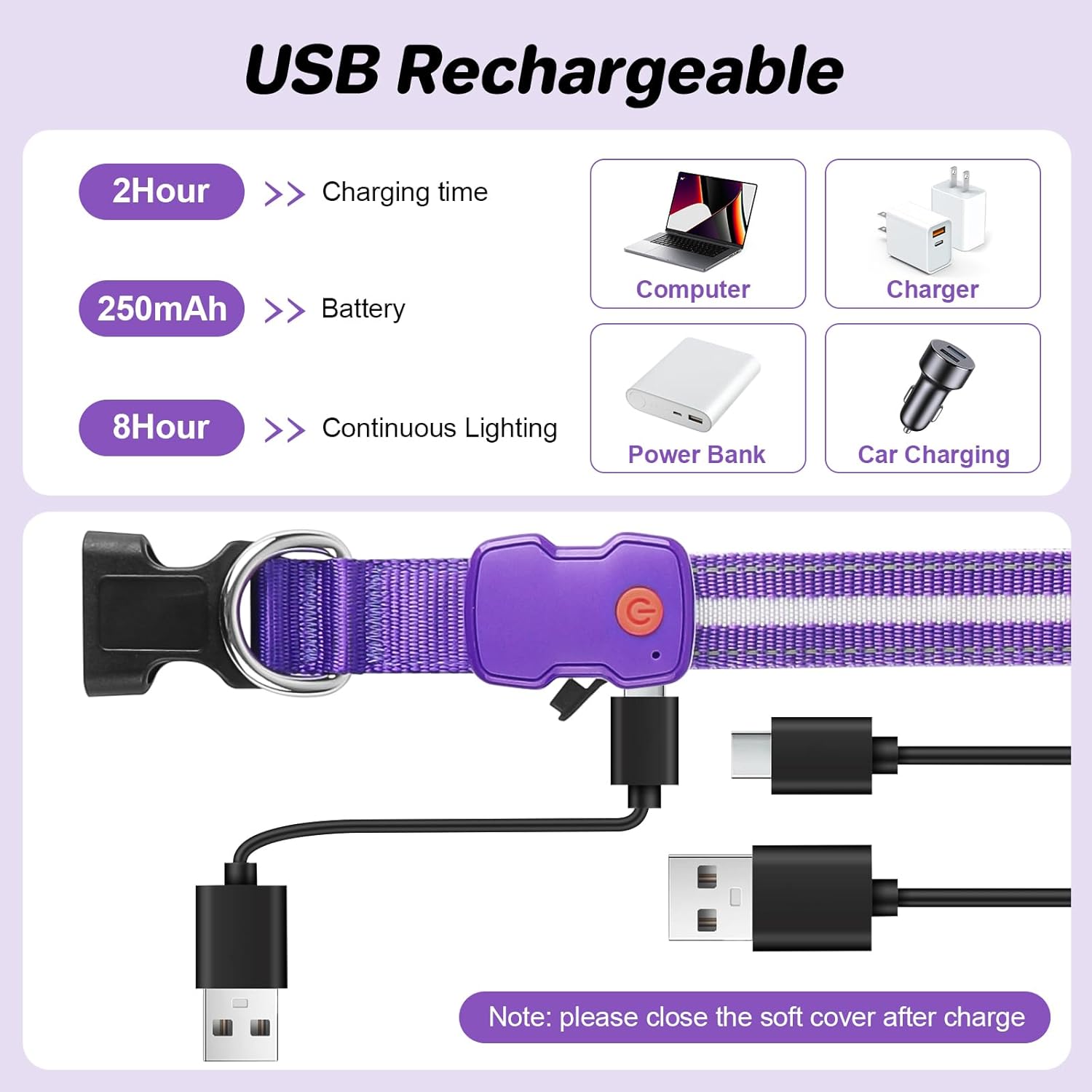 PcEoTllar Light Up Dog Collars, Led Dog Collar, Rechargeable, Night Walking, Waterproof, Glow in The Dark Dog Collars Light for Large Small Medium Dogs, Purple l