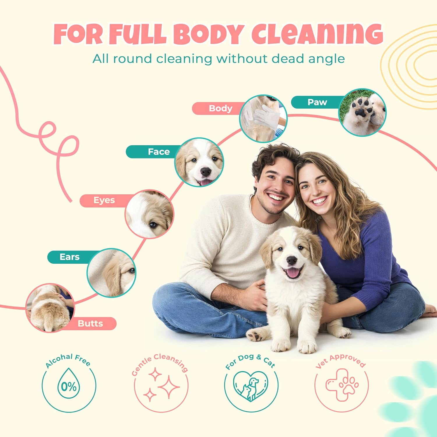 Pet Glove Wipes for Dogs & Cats | No Rinse Full Body Cleaning Gloves | Ear & Eye Wipes Set | Gentle Grooming for Paws Face Ears Coat | Alcohol Free