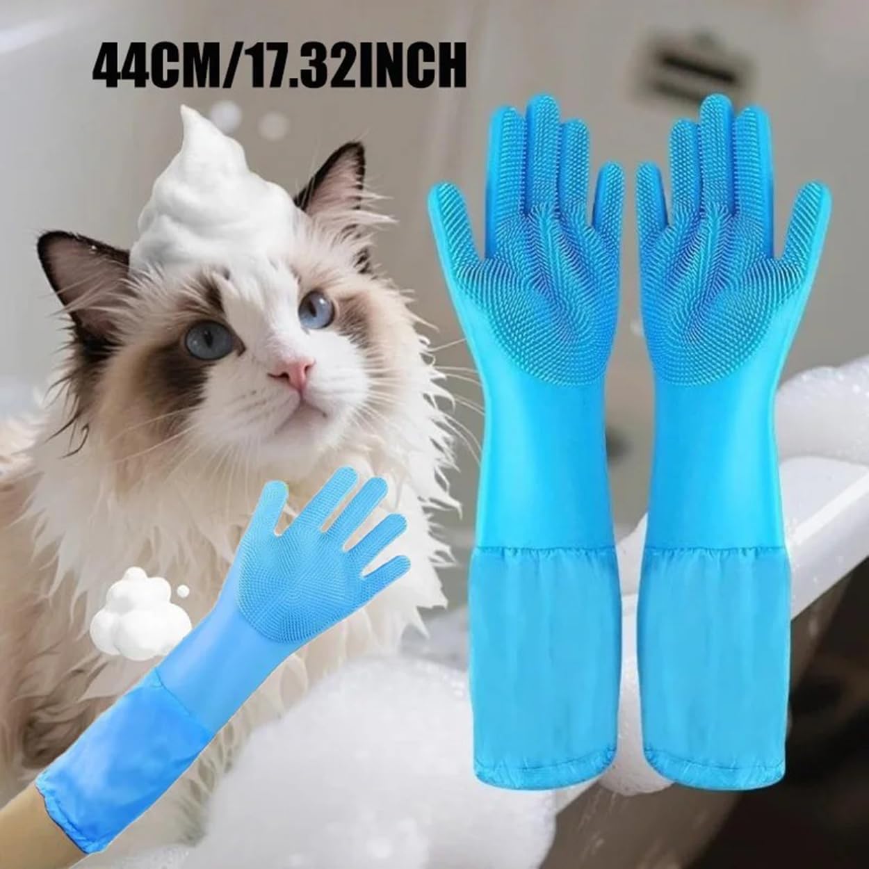 The extended length and cuff provides good coverage and protection during bathing, while the textured palm area ensures thorough cleaning and deshedding