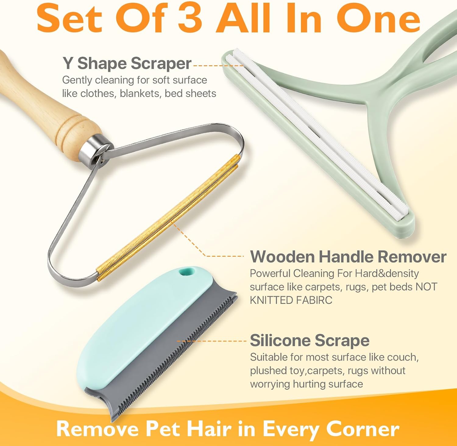 3 of Versatile Pet Hair Removal Tool – 3 type of pet hair remover aims to different surface hair cleaning. Copper with wooden handle pet hair remover be used for heavy duty and thick piled items, such as carpet, rug, couch, , blanket, cat tree etc. Y shape tool can be used for soft and thin fabrics, like upholstery, velvet, bed sheet and etc. The blue Silicone tool features smooth TPE teeth that won’t snag fabrics, perfect for soft items like plush items, blankets, and pillows.
