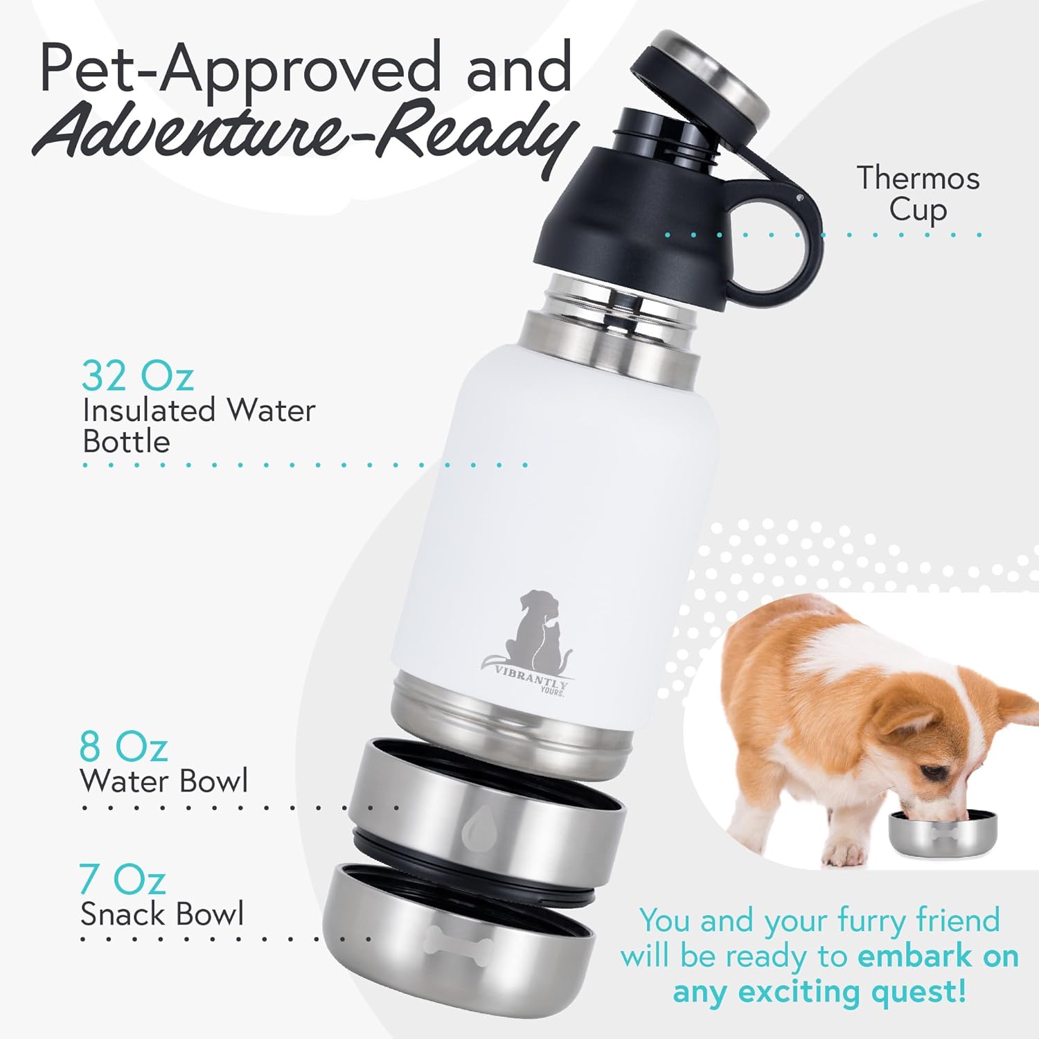 At Vibrantly Yours, our mission is to make your life easier by providing an amazing selection of pet supplies and accessories that promise to impress when it comes to functionality, performance and ease of use. We rely on our commitment to exceptional quality and passion for innovation to bring to your doorstep high-end products that will meet your needs as a pet owner without sacrificing your pet’s safety. If you encounter any problems with your order, there is no need to worry because we are always at your service to address any issues or concerns. Portable Water Bottle with 2 Built-In Bowls and Carrying Bag Be prepared to travel with your dog by packing all the essentials and making sure our portable dog water bottle is not missing! This canteen water bottle features an ingenious design with 2 built-in bowls for food and water that allow you to quench your dog’s thirst and hunger, regardless of your location. Don’t worry, the double wall stainless steel insulation and leakproof design ensure excellent thermal retention and no spills, so your pet can always enjoy fresh, cold water! The portable dog water bowl dispenser also comes with a practical carrying bag designed with a poop bag dispenser, which means that you will have all your pet’s travel essentials in one place! Still not convinced? Here are some of the amazing features of our portable dog water bottle: 1. Includes 2 bowls for food and water; 2. Includes carrying bag with poop bag dispenser; 3. BPA-free and food-grade; 4. Durable stainless steel construction; 5. Double wall insulated bottle; 6. Leakproof and secure; 7. Practical design with handle; 8. Portable water bottle for walking, traveling, hiking, park, trips; 9. 32oz capacity; Traveling with your pet is so fun and easy now with our portable dog water bottle!