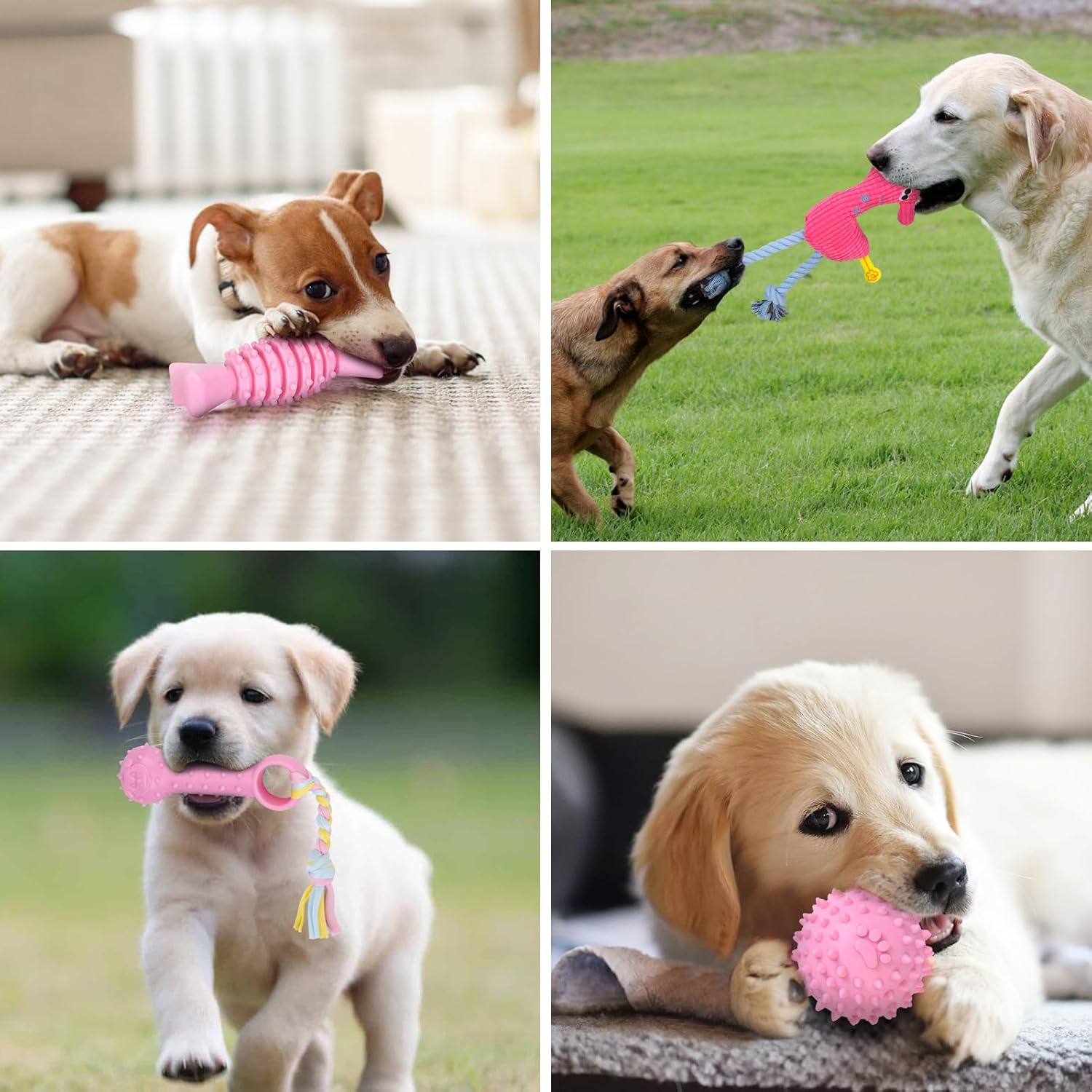Best Set Combination: 2 teething toys are used to relieve the discomfort caused by dog teething, 2 different balls are suitable for indoor and outdoor play, and an interactive tug-of-war toy to enhance the relationship with the dog. 1 squeaky plush toy made of soft cotton, bringing a sense of security to your dogs, and it will be the perfect companion for your dog.