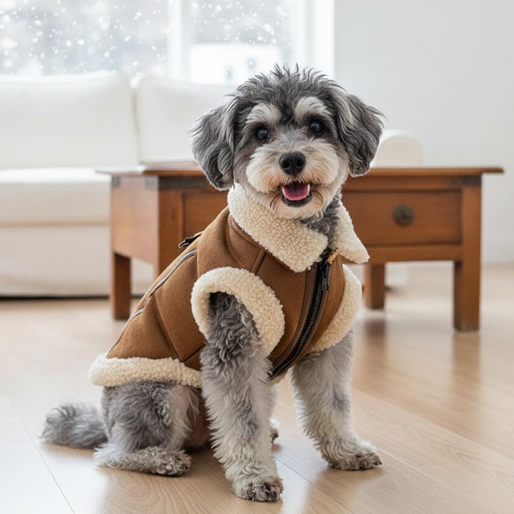 【Classic Retro Aviator Style】 Vintage pilot-inspired dog coat with sleek faux leather exterior and plush sherpa fleece lining. Timeless bomber design offers stylish, functional cold-weather protection for walks, travel, holiday outings and seasonal adventures.