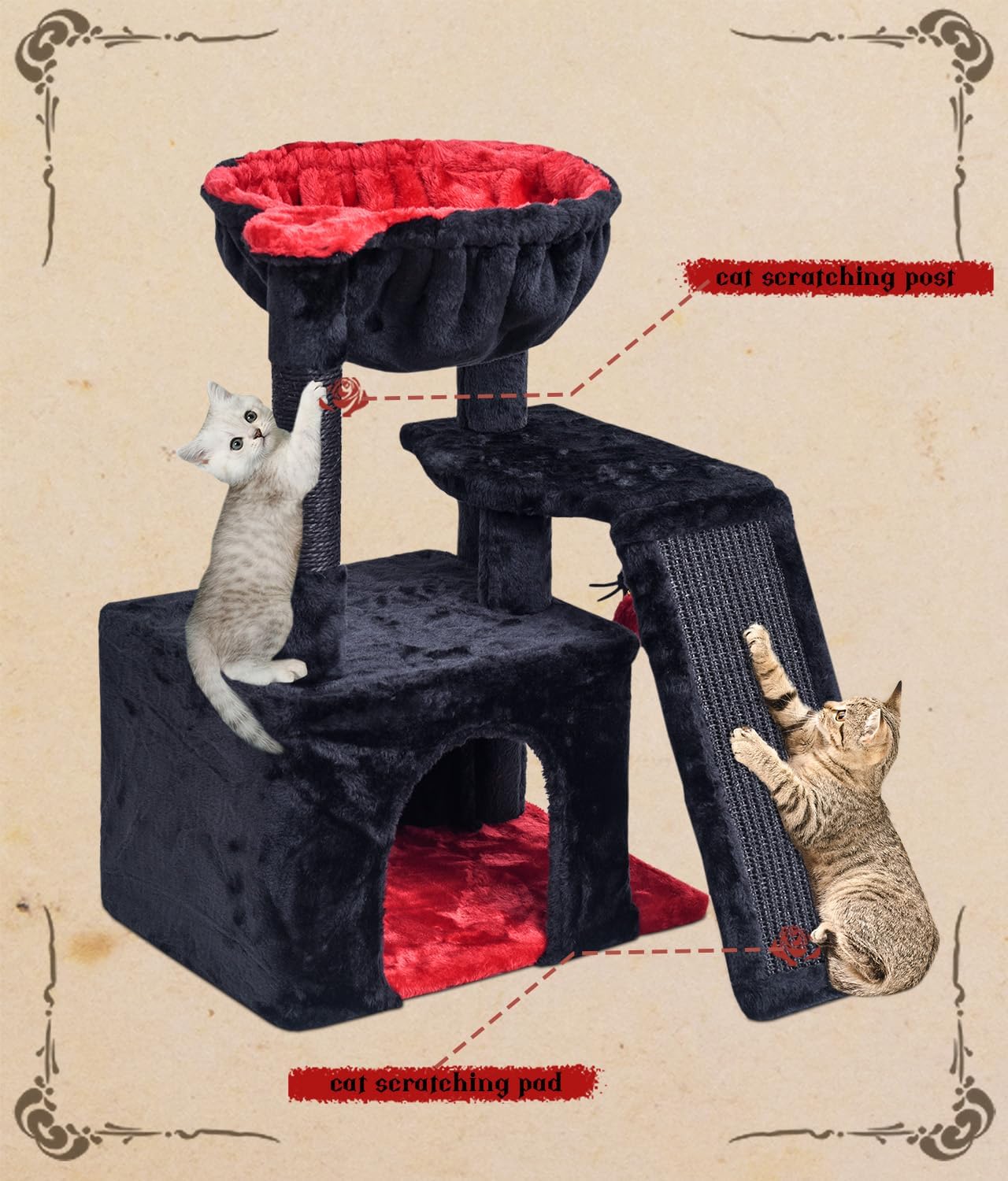 [EASY TO ASSEMBLE] This cat tower easy to put together with detailed graphic instructions. Overall dimension – 16.14” L x 12.12” W x 23.62” H. This cat play tree in classic color will decor your room as a piece of modern cat furniture