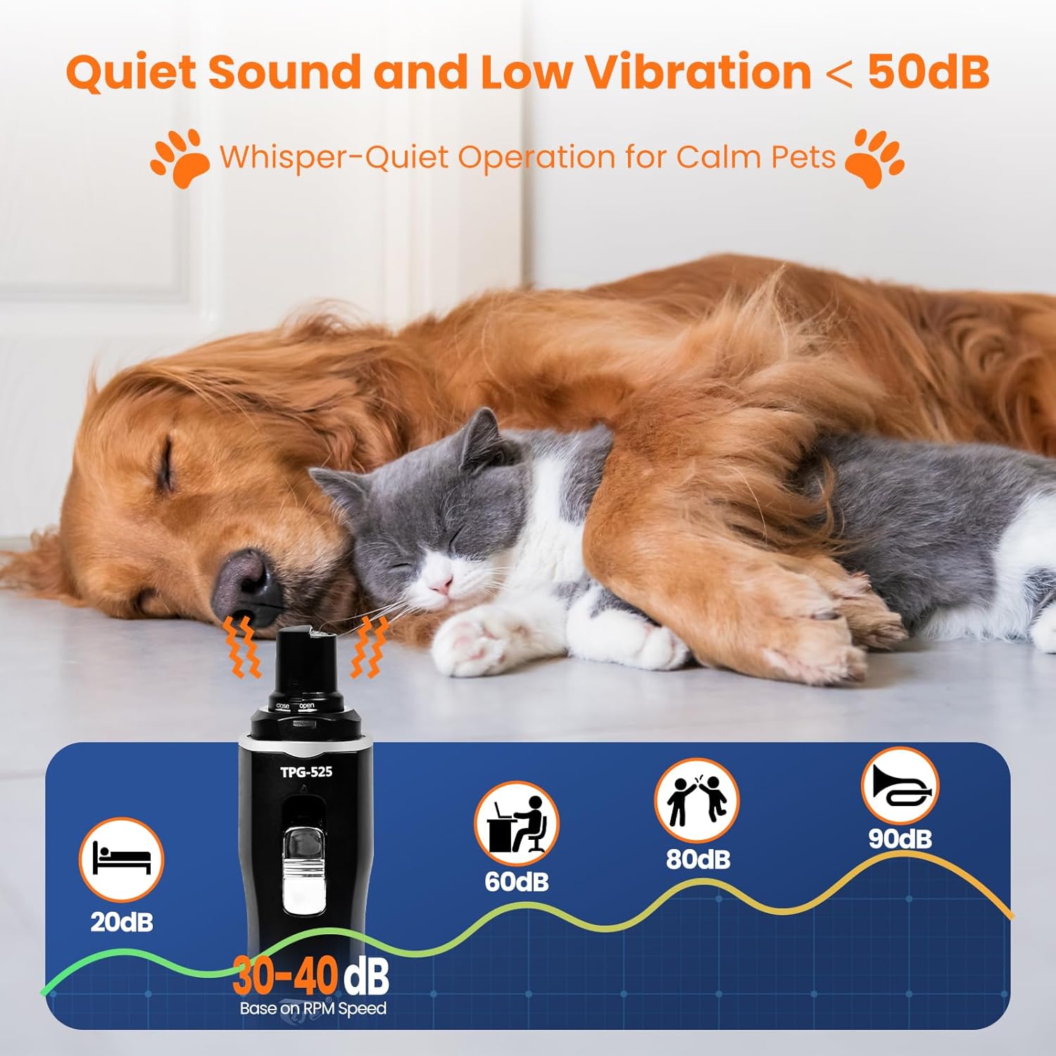 【Efficient Motor and Precise Nail Care】: This silent groom pro nail grinder for dogs&cats professional edition is equipped with 4.8V Copper Core Motor, the durable copper core of powerful pet nail grinder for dogs is enhanced with 50% more torque to handle the various thick, tough nails for large breeds quickly and easily. The nail trimmer for dogs has 3 grinding ports and 2 switch speed settings, the users can choose these function to achieve the effective pet nail grooming according to the pets’nail thickness and length.