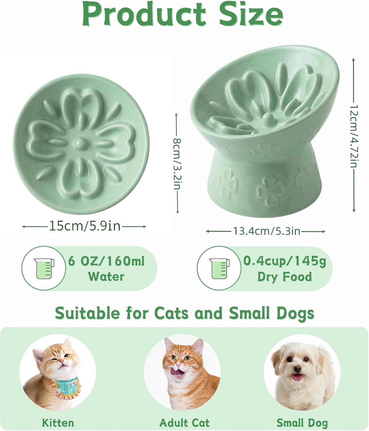 【Exquisite Relief & Multi-Purpose Use】The exterior is adorned with exquisite four-leaf clover relief patterns, offering a unique and luxurious look. With a perfect capacity for 145g of food or 160ml of water, it is an ideal anti vomit cat bowl slow feeder for kittens, adult cats, and small dogs. Suitable for dry kibble, wet canned food, treats, and water.