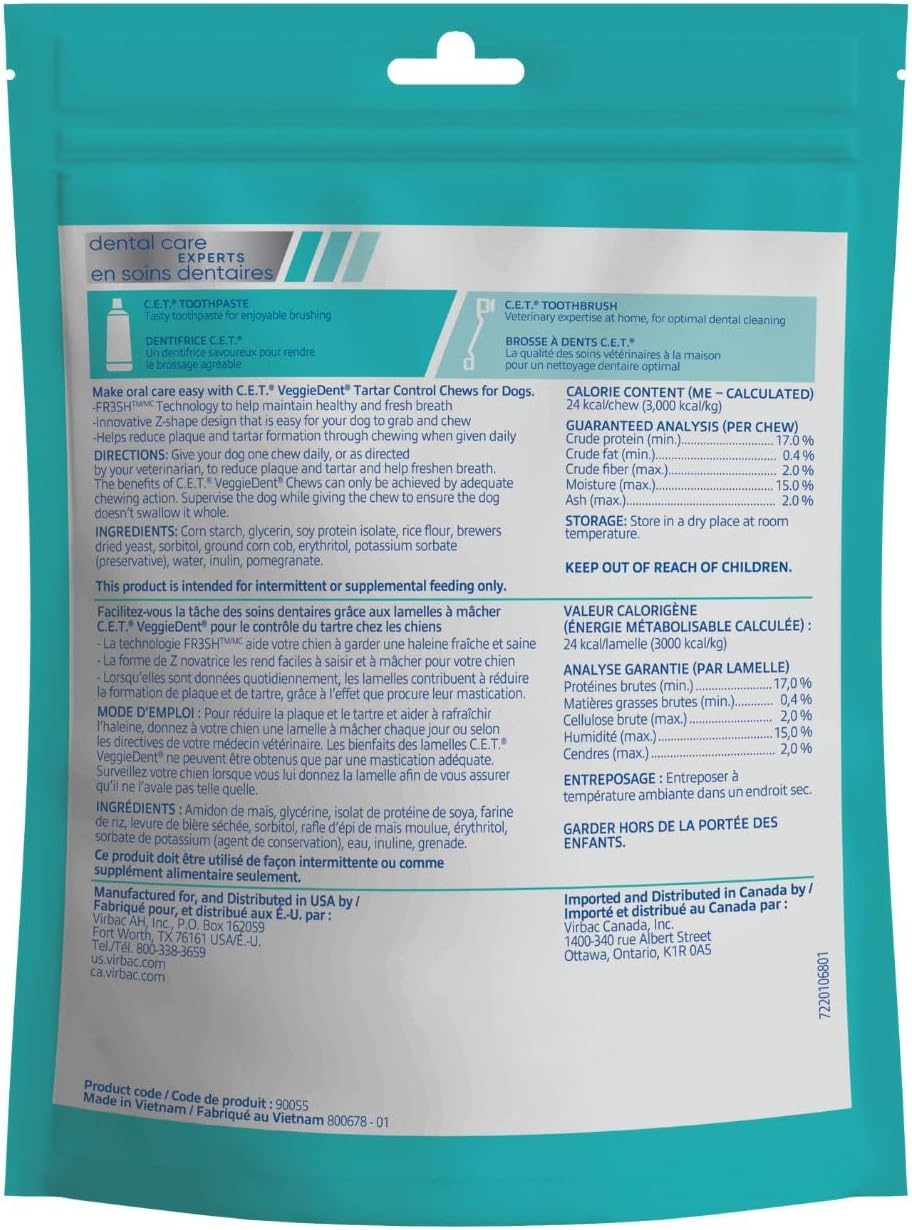 CET VEGGIEDENT FR3SH Tartar Control Chews combine a 3 way Performance that cleans teeth, freshens breath, and supports proper digestion. Virbac CET VEGGIEDENT FR3SH Tartar Control Chews for dogs uniquely target bad breath and supports proper digestion for your dog – Plus, they’re VOHC accepted! Each chews addresses the oral causes of bad breath, with innovative breath freshening effects. The “Z Shape” maximizes prehension, allowing the chew to scrape away the tarter in hard to reach places, while enhancing the mechanical action of chewing. 90% of pet owners noticed significant improvement in their pet’s breath from day 1, with continued improvement after a 14 day period.