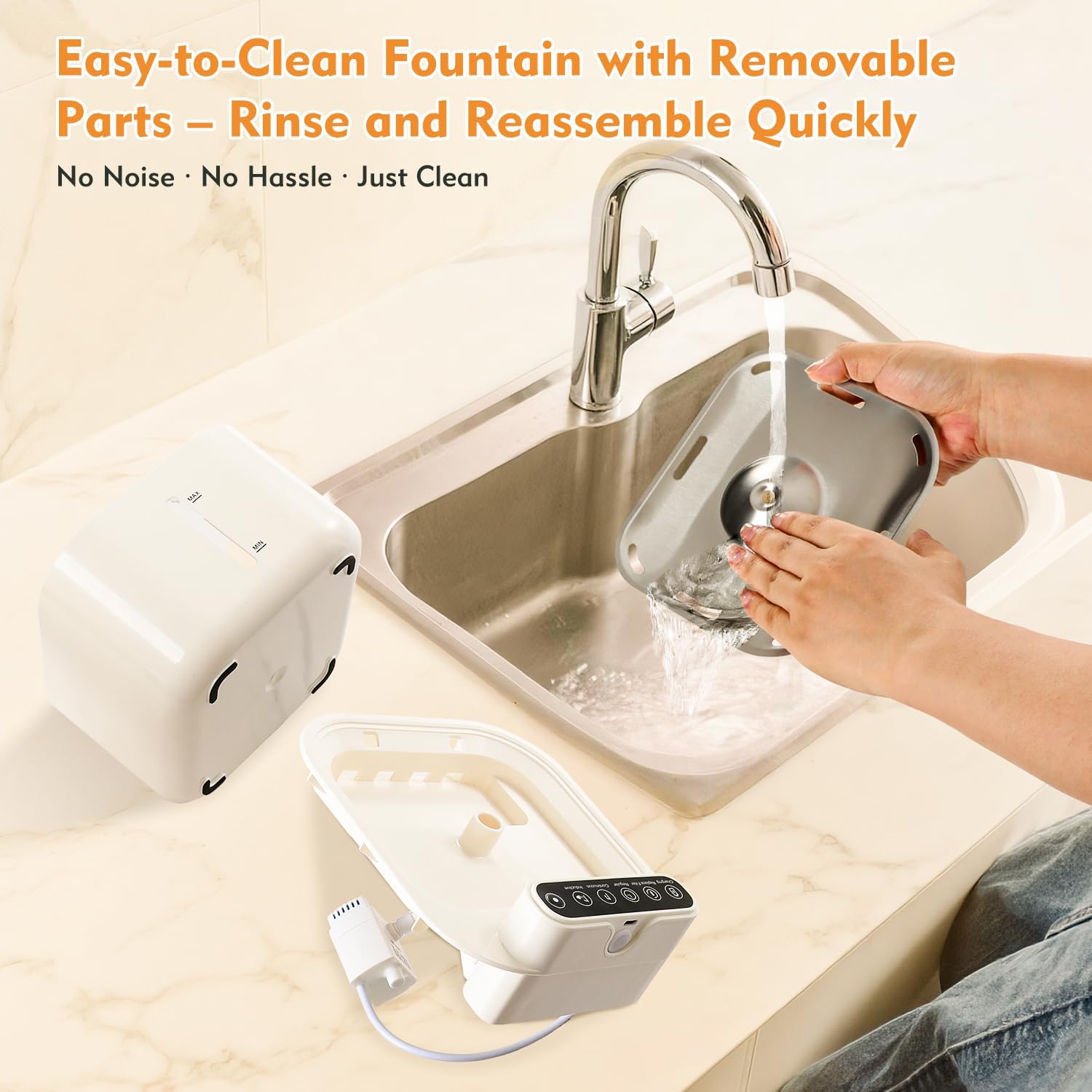 4-Stage Filtration, Fresher Water: The built-in system includes non-woven fabric, activated carbon, ion exchange resin, and a high-density sponge to help minimize visible impurities like fur, dust, and minerals. The 304 stainless steel water tray resists buildup and is easy to clean, helping maintain a fresh and hygienic drinking fountain.