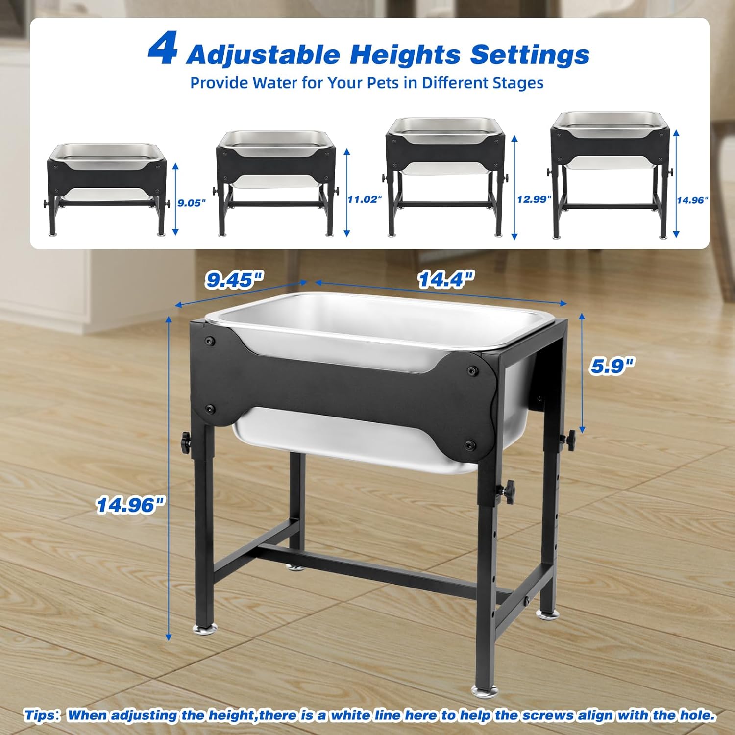 Easy to assemble: Our dog water bowl set for messy drinkers includes a 3-gallon water bowl * 1, an adjustable metal bracket * 1, dust-free water-soluble chalk * 1, and an instruction manual * 1; You just need to follow the installation steps in the manual, and you will soon be able to assemble this 2-in-1 elevated dog bowls; Your pets will definitely not be able to wait to use it in the scorching summer